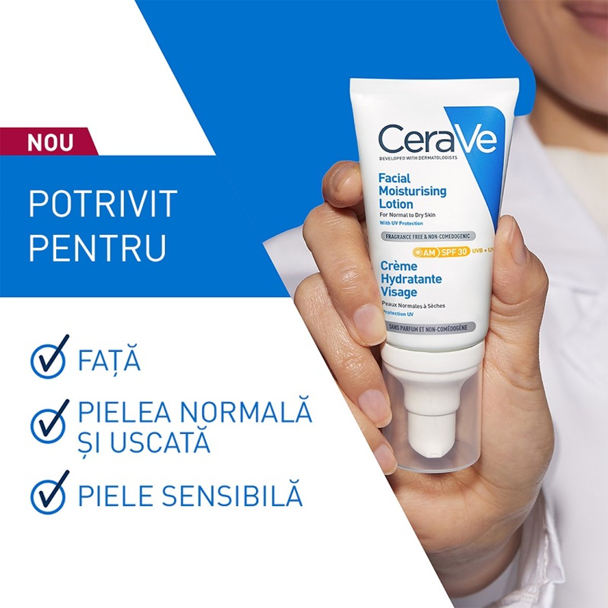 Crema hidratanta ultra-lejera pentru fata, cu protectie SPF 30 UVB/UVA si 3 ceramide esentiale, ce ajuta la protejarea barierei pielii, oferind hidratare pana la 24 de ore. Utilizare: Aplica produsul dimineata pe fata si pe gat. Foloseste produsul in fiecare zi sau de cate ori este nevoie. Ingrediente si inovatie : CeraVe Crema Hidratanta pentru fata A.M. SPF 30 este formulata cu 3 ceramide esentiale ce ajuta la restabilirea barierei de protectie a pielii si ofera protectie solara ridicata cu spectru larg de acoperire, pentru a proteja pielea in timpului expunerii zilnice la radiatiile UVA/UVB, printr-un singur pas. Aceasta crema hidratanta contribuie la protejarea pielii impotriva particulelor de poluare. Cu ajutorul tehnologiei MVE, formula sa ultra-lejera ofera o eliberare continua a ingredientelor hidratante pe parcursul zilei si asigura hidratare timp de 24 de ore. De asemenea, contine vitamina E si niacinamida pentru a mentine pielea catifelata si hidratata pe parcursul intregii zile. Recomandare: Pentru tenul Normal si Uscat Lista completa ingrediente: AQUA/WATE., GLYCERIN, ISOPROPYL PALMITATE, BIS- ETHY LHEXYLOXYPHENOL METHOXYPHENYL TRIAZINE, ETHYLHEXYL SALICYLATE, NIACINAMIDE, PENTYLENE GLYCOL, BUTY METHOXYDIBENZOYLMETHANE, ETHYLHEXYL TRIAZONE, PROPANEDIOL, ZEA MAYS STARCH/CORN STARCH, POTASSIUM CETYL PHOSPHATE, DIISOPROPYL SEBACATE, ORYZA SATIVA CERA/RICE BRAN WAX, STEARIC ACID, CERAMIDE NP, CERAMIDE AP, CERAMIDE EOP, CARBOMER, GLYCERYL STEARATE, CETEARYL ALCOHOL,TRIETHANOLAMINE, BEHENTRIMONIUM METHOSULFATE, TRIETHYL CITRATE, SODIUM HYALURONATE, SODIUM POLYACRYLATE, SODIUM LAUROYL LACTYLATE, MIYRISTIC ACID, CHOLESTEROL, PALMITIC ACID, TOCOPHEROL, CAPRYLYL GLYCOL, CITRIC, ACID, TRISODIUM ETHYLE NEDIAMINE DISUCCINATE, XANTHAN GUM, PHYTOSPHINGOSINE, ACRYLATES/C10-30 ALKY L ACRYLATE CROSSPOLYMER, BUTYROSPERMUM PARKII BUTTER/SHEA BUTTER, BENZOIC ACID, PEG-100 STEARATE. (Code F. I. L. Y292332/1) Atentionari: Evitati contactul cu ochii. In cazul contactului cu ochii, clatiti imediat cu apa din abundenta. Numele, denumirea comerciala inregistrata sau marca comerciala inregistrata a producatorului, precum si adresa postala si de e-mail la care producatorul poate fi contactat: LOréal Romania SRL, Calea Floreasca nr. 169A, Cladire A, etaj 6, sector 1, 014430, Bucuresti, Romania;