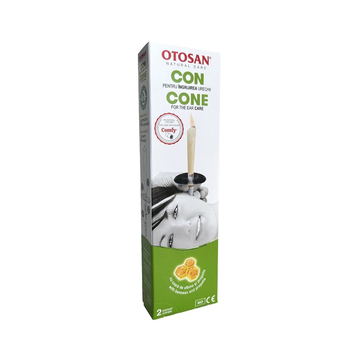Conurile Otosan sustin igiena urechii intr-un mod simplu, sigur si eficient, fiind un sistem natural ce provine din traditiile populare stravechi. Imbunatatit cu dispozitive inovatoare de siguranta si confort, conul pentru curatarea urechii Otosan este un dispozitiv natural, practic, sigur si eficient, care prin caldura benefica si efectul de tiraj, ajuta la eliminarea impuritatilor si a excesului de ceara din ureche. Datorita aplicatorului patentat Comfy, tratamentul este mai sigur, confortabil si eficient. ACTIUNE: Cercetarile clinice au demonstrat eficienta conurilor Otosan in mentinerea igienei urechii atat pentru adulti cat si pentru copii. Folosit regulat, previne afectiunile si disconfortul cauzate de lipsa unei igiene corecte, care ignorata, poate afecta sanatatea urechii pe termen lung. Ajuta la prevenirea acumularii de ceara si sprijina eliminarea acesteia, contribuind astfel la restabilirea presiunii urechilor, dupa petrecerea timpului pe munte, in zbor sau in urma scufundarilor. Caldura generata prin arderea conului Otosan patrunde delicat in canalul auricular si inmoaie cerumenul creand asa-numitul efect de tiraj sau „de semineu”. Conul Otosan poate fi utilizat cu eficienta pentru indepartarea dopurilor de cerumen care pot cauza numeroase simptome cum ar fi: prezenta unor sunete (bazait, tiuit, zumzet), senzatia de presiune in ureche, diminuarea auzului, senzatia de ureche infundata. REZULTATE: Mentin igiena urechii, pentru adulti si copii mai mari de 3 ani. Este recomandat pentru adulti si copii, in special pentru persoanele care lucreaza in medii cu praf, pentru cei care sufera de exces de ceara in urechi si pentru persoanele care folosesc aparate auditive externe. De asemenea, ajuta la eliminarea oricarei cantitati de apa reziduala din canalul urechii acumulate dupa inotul in mare sau in piscina. Prin adaugarea de propolis, conurile Otosan dezvolta o actiune eficienta de protectie, deoarece caldura creata regenereaza fluxul sanguin local, oferind senzatia unei stari de bine si o relaxare fizica generala. INGREDIENTE: Bumbac, parafina, ceara de albine, stearina vegetala, propolis. MOD DE UTILIZARE: 1. Introduceti capatul mai ingust al conului 1 cm in aplicatorul Comfy. Asigurati-va ca al doilea aplicator Comfy nu se afla in interiorului conului. 2. Introduceti conul in discul de protectie (cu partea argintie in sus), pana cand atinge inelul pentru intreruperea flacarii. Aprindeti capatul mai mare al conului. 3. Puneti-va capul pe o suprafata plata si inserati conul cu aplicatorul Comfi in partea exterioara a canalului auricular, mentinandu-l in pozitie verticala pe toata perioada tratamentului. 4. Odata ce flacara a ars complet conul pana la inelul de intrerupere a flacarii, scoateti-l din ureche si stingeti-l intr-un pahar cu apa. Repetati tratamentul si pentru cealalta ureche. Este normal ca in timpul tratamentului sa vedeti abur iesind de la baza conului. MOD DE PREZENTARE: Cutia contine: 2 conuri, disc de protectie, instructiuni de utilizare, 2 dispozitive Comfy. Produs testat clinic - Hipoalergenic. Dispozitiv medical. AVERTIZARI / PRECAUTII: Produsul se depoziteaza intr-un loc racoros, intunecat, neexpus la surse directe de caldura si umiditate. Depozitati produsul la temperaturi intre -10 ° si 40 °C. Utilizati produsul la temperatura ambientala (8 - 25 °C). Utilizarea unei flacari deschise implica o atentie sporita: parul si fata trebuie protejate impotriva focului, in mod adecvat. Tratamentul trebuie realizat exclusiv sub supravegherea unui adult, intr-un loc unde nu exista curenti de aer si substante si/sau obiecte inflamabile. A nu se utiliza in cazul existentei unor afectiuni ale urechii, a unor interventii chirurgicale recente sau in cazul unor alergii la componentele produsului. A nu se utiliza pentru copii cu varsta sub 3 ani. Inainte de utilizare, consultati un specialist ORL care poate confirma prezenta dopului de cerumen si asigurati-va ca problemele pe care le resimtiti se datoreaza acestuia si nu altor afectiuni. In cazul aparitiei unor efecte nedorite, contactati medicul sau producatorul. Daca il utilizati impreuna cu alte medicamente/dispozitive medicale, consultati mai intai medicul. Nu inghititi produsul si nu-l introduceti in alte orificii decat canalul auricular.