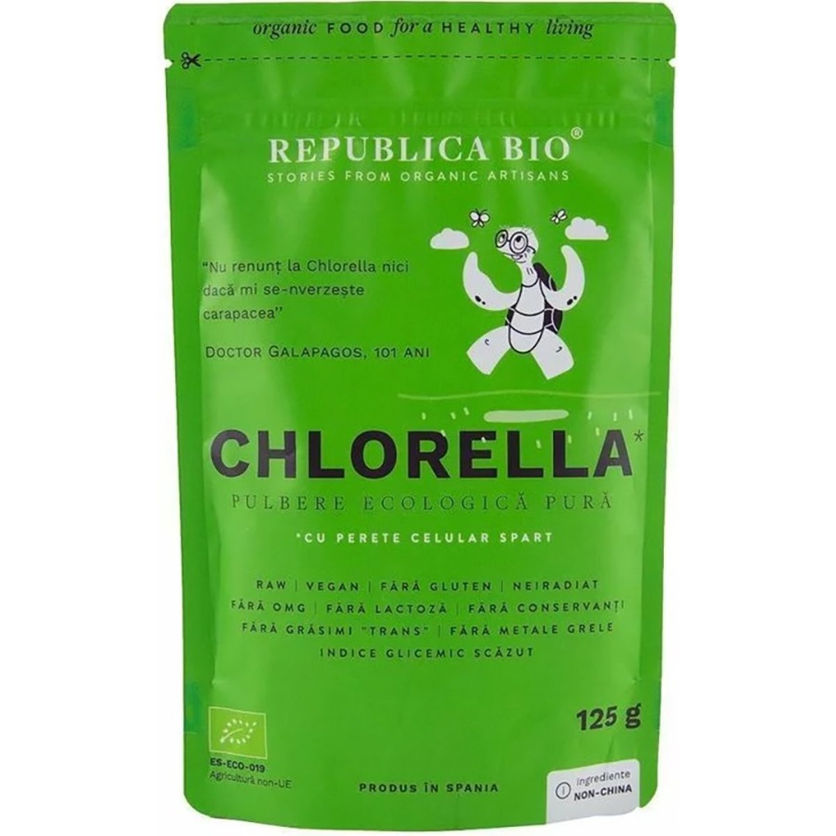 De ce sa alegi produsul?• Certificat ecologic: Produs conform standardelor stricte ale Uniunii Europene pentru agricultura ecologica, fara organisme modificate genetic, neiradiat.• Fara alergeni: Fara urme de gluten, lactoza, nuci, alune, soia, ou sau alte alergene, potrivit pentru diete speciale.• Testat fizico-chimic: Verificat impotriva pesticidelor, metalelor grele si contaminantilor.• Ambalat intr-o fabrica fara gluten: Produsul este ambalat intr-o unitate ce nu proceseaza gluten, garantand lipsa contaminarii incrucisate.• Absorbtie imbunatatita: Chlorella Republica Bio are peretele celular spart, facilitand o absorbtie mai eficienta a nutrientilor in organism.Ideal pentru:• Detoxifiere naturala: Ajuta la eliminarea metalelor grele si a toxinelor din organism.• Persoane active: Sustine nivelul de energie si vitalitatea zilnica.• Sustinerea sistemului imunitar: Datorita continutului ridicat de clorofila, Chlorella sprijina sanatatea sistemului imunitar.• Imbunatatirea digestiei: Contribuie la mentinerea sanatatii sistemului digestiv si la imbunatatirea tranzitului intestinal.• Persoane cu alergii: Fiind un produs fara alergeni, este ideal pentru cei cu sensibilitati alimentare.Beneficii cheie:• Energie si vitalitate: Ofera un aport semnificativ de proteine si nutrienti esentiali, sustinand energia si vitalitatea.• Detoxifiere eficienta: Ajuta la eliminarea toxinelor si metalelor grele din organism, sprijinind un metabolism sanatos.• Sprijin pentru sistemul imunitar: Continutul ridicat de clorofila si nutrienti sustine sanatatea sistemului imunitar.• Fara alergeni: Sigur pentru toate tipurile de diete speciale, fiind lipsit de alergeni comuni.• Absorbtie imbunatatita: Peretele celular spart asigura o absorbtie mai rapida si eficienta a nutrientilor.• Dupa deschidere, pastreaza produsul la temperatura camerei, in punga bine inchisa. Fereste-l de umiditate si de razele directe ale soarelui.• Mod de utilizare: Adauga 1 lingurita de Chlorella in smoothie-uri, shake-uri proteice, iaurturi sau sucuri de fructe. Se poate adauga si in supe, salate sau muesli.• Doza recomandata: Femeile (50-70kg) pot consuma 4-5g pe zi, iar barbatii (70-120kg) intre 5-10g pe zi.
