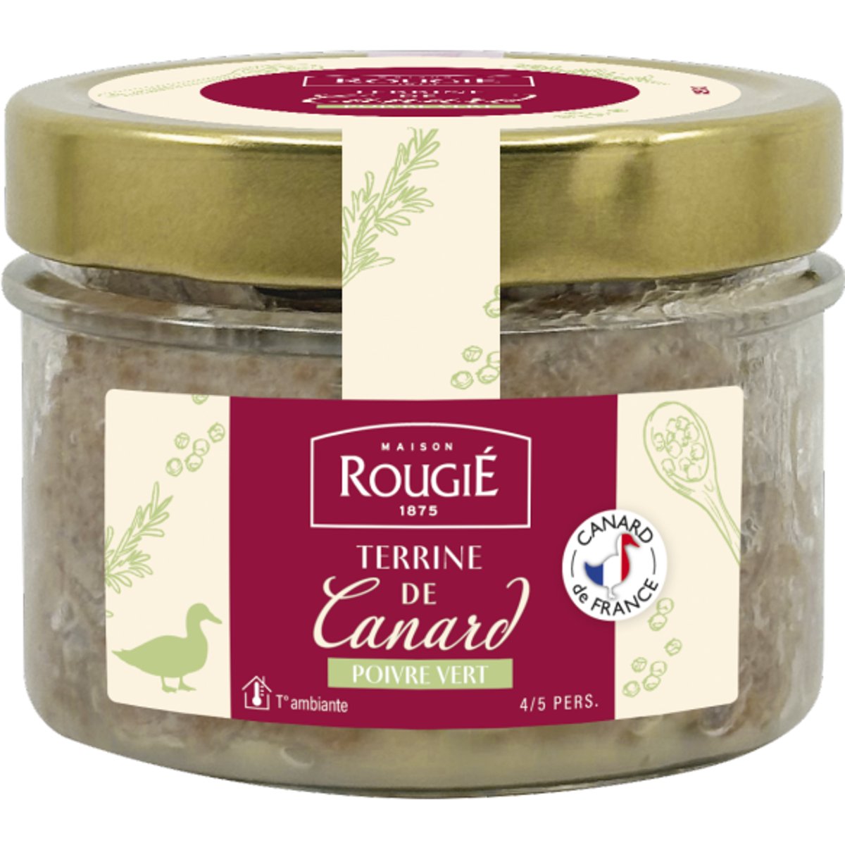 Rougie 180g Terină de rață cu boabe de piper verde (TERRINE DE CANARD AU POIVRE VERT)TERINA SEMI GĂTITĂ DE RAȚĂBlocul este fabricat din foie gras (cu sau fără bucăți), care este condimentat înainte de a fi modelat. Mai puțin rafinat decât Whole, oferă un gust mai blând și o textură foarte topită în gură.Gust grozav de terină de rață cu coniac, boabe de piper verde, ceapă pre-prăjită și condimente.1 pachet este potrivit pentru 4-5 persoane.