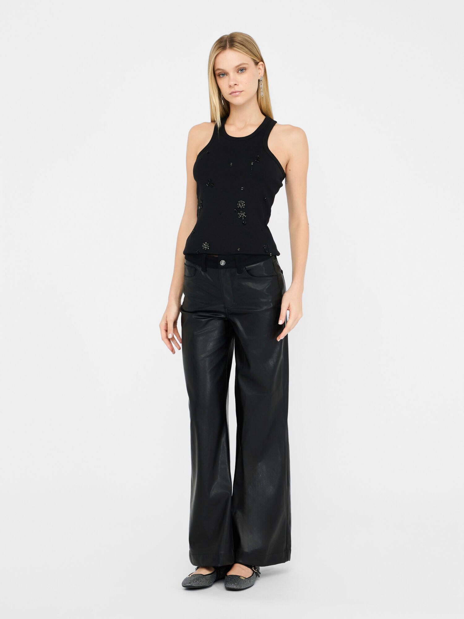 Design: Model cu 5 buzunare, Buzunare cu clapă/ cu laist; Tip de închidere: Fermoar; Material: Imitație de piele; Imprimeu: Monocrom; Lungimea: Lung/maxi; Tipul croiului: Wide leg; Tipul taliei: High waist