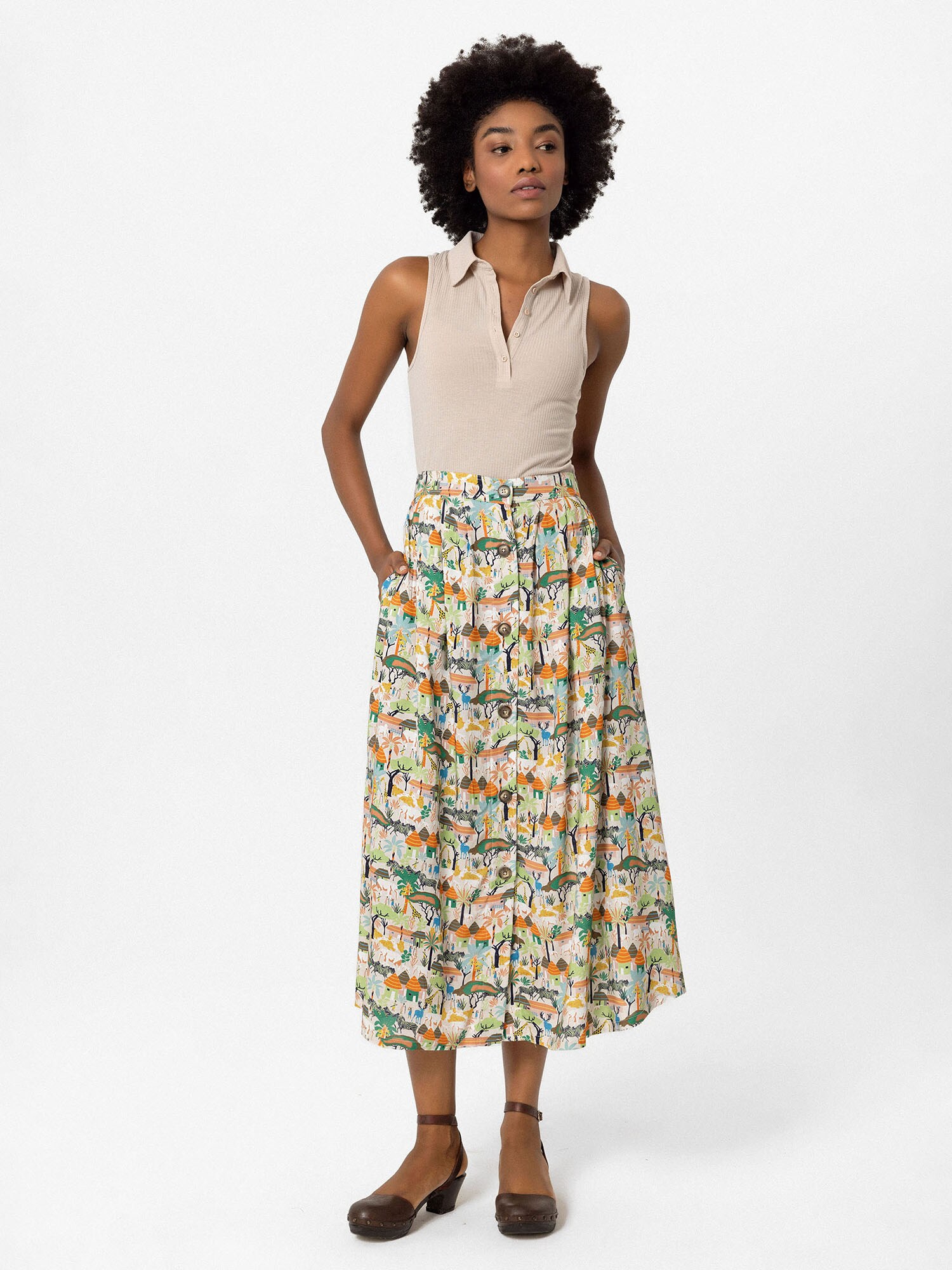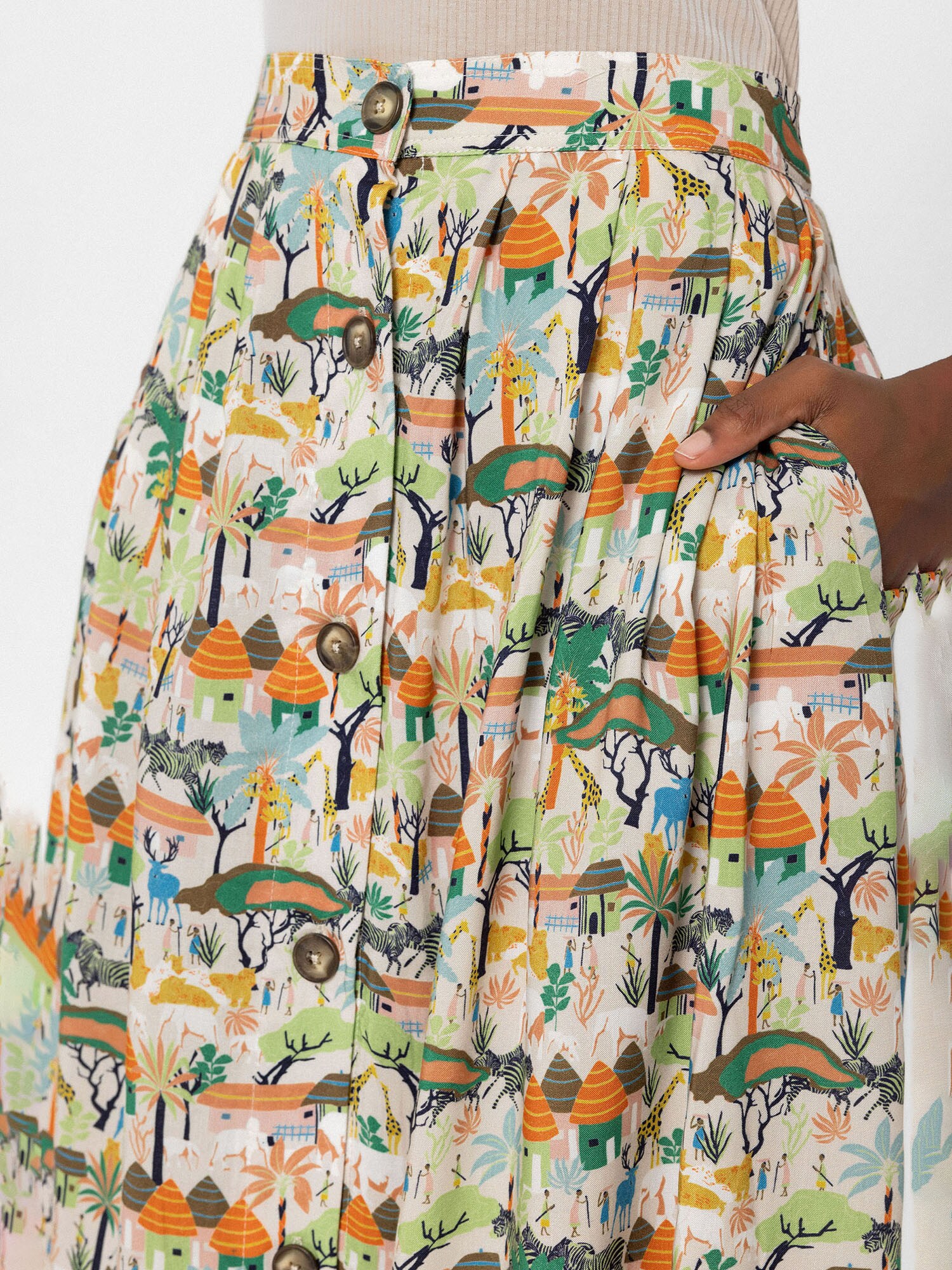 Design: Șir de nasturi, Buzunare laterale deschise; Tip de închidere: Închidere cu nasturi; Material: Viscoză; Forma fustei: Plisată; Detalii: Pliuri; Detalii: Imprimat în totalitate; Lungimea: Lungime 3/4; Croi: Croi normal