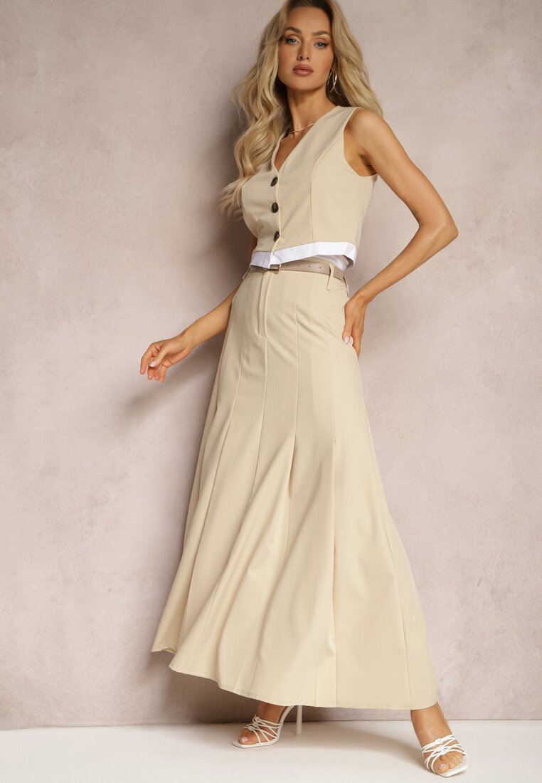 Fustă Bej Lungă Evazată Talie înaltă Leoraia