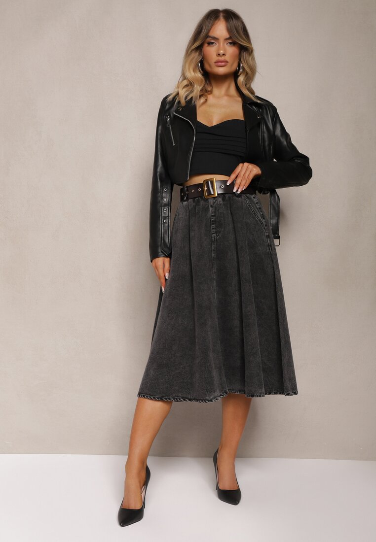 Fustă Midi Evazată din denim Neagră cu curea Wendlla