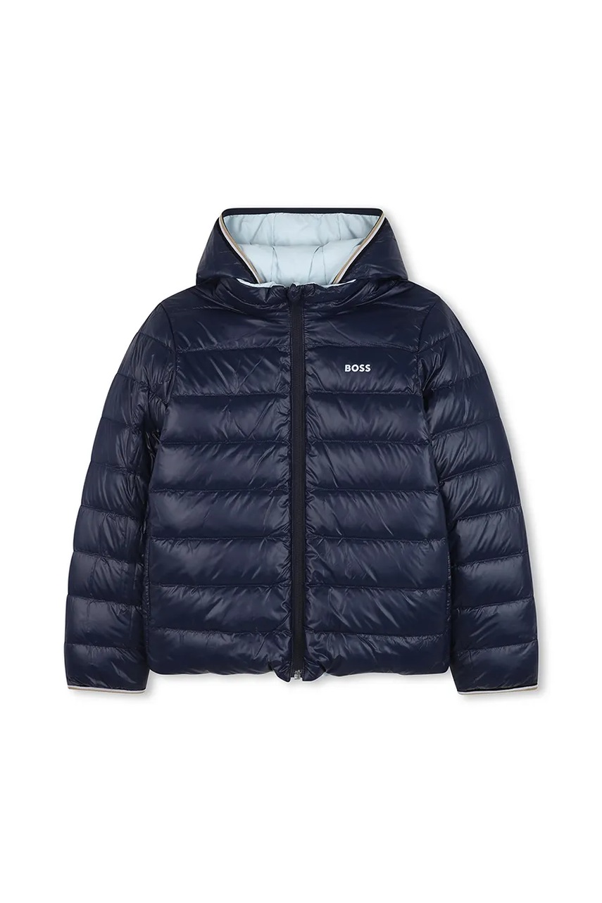 Geacă de puf pentru copii din colecția BOSS. Model izolat confecționat din material matlasat. Modelul cu puf natural și umplutură din pene oferă confort suplimentar la temperaturi mai scăzute.