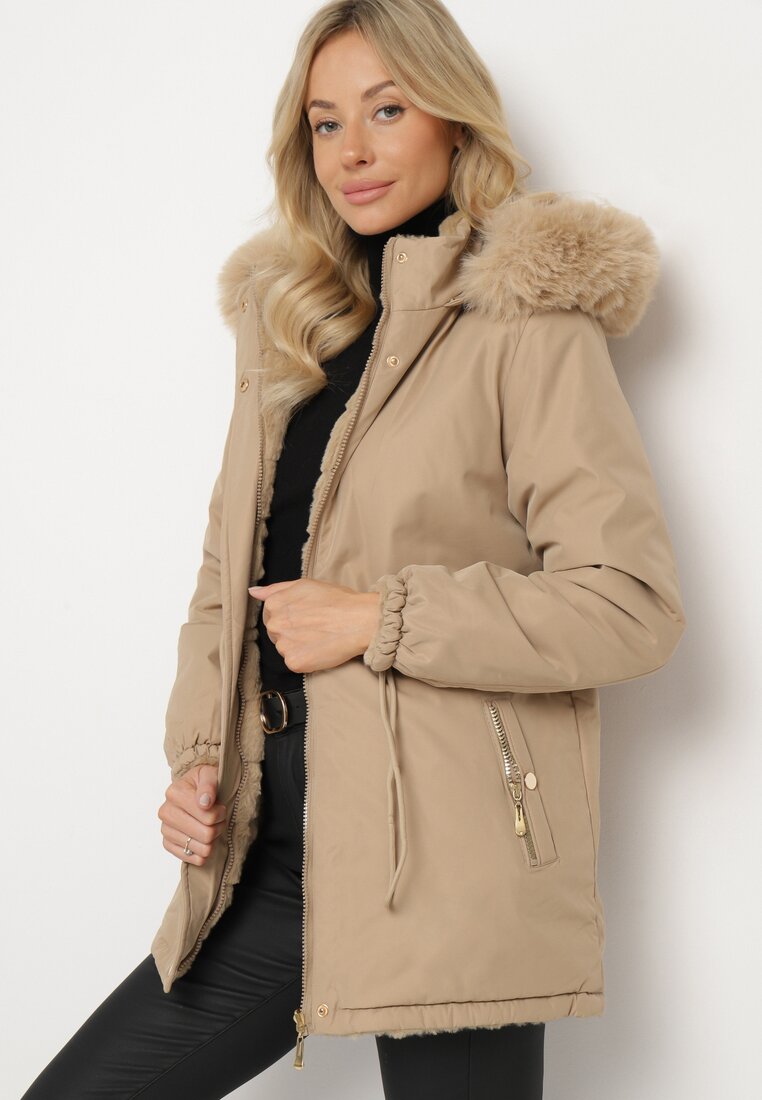 Jachetă Parka Bej-închisă Reversibilă cu Glugă Detașabilă și Căptușeală de Blană Zinnalea