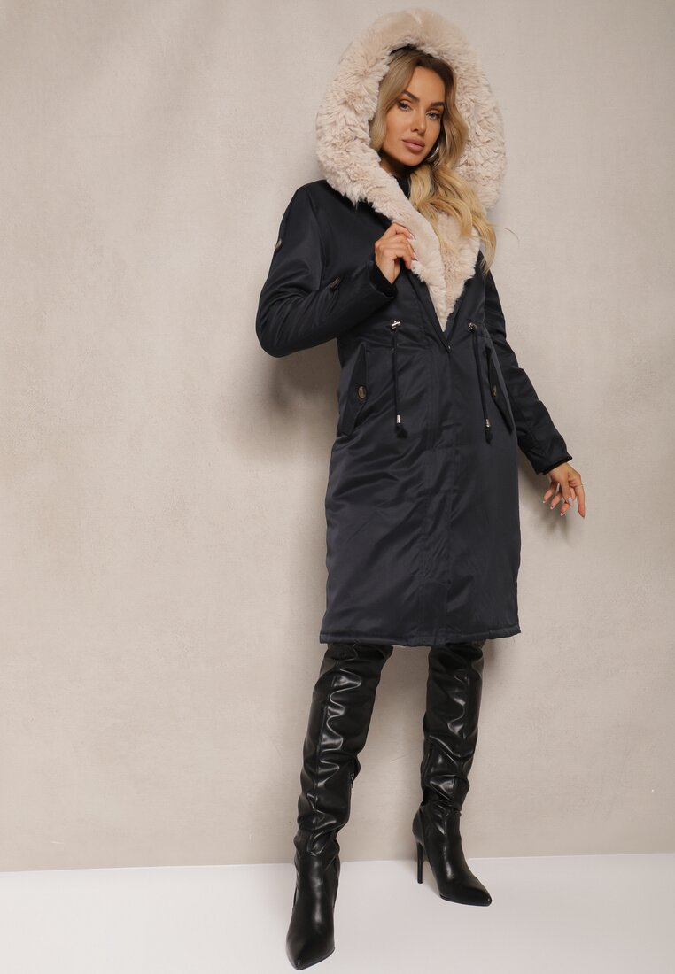 Geacă Parka Bleumarin-Bej Căptușită cu Glugă cu Blană Detașabilă Strânsă în Talie Melintina