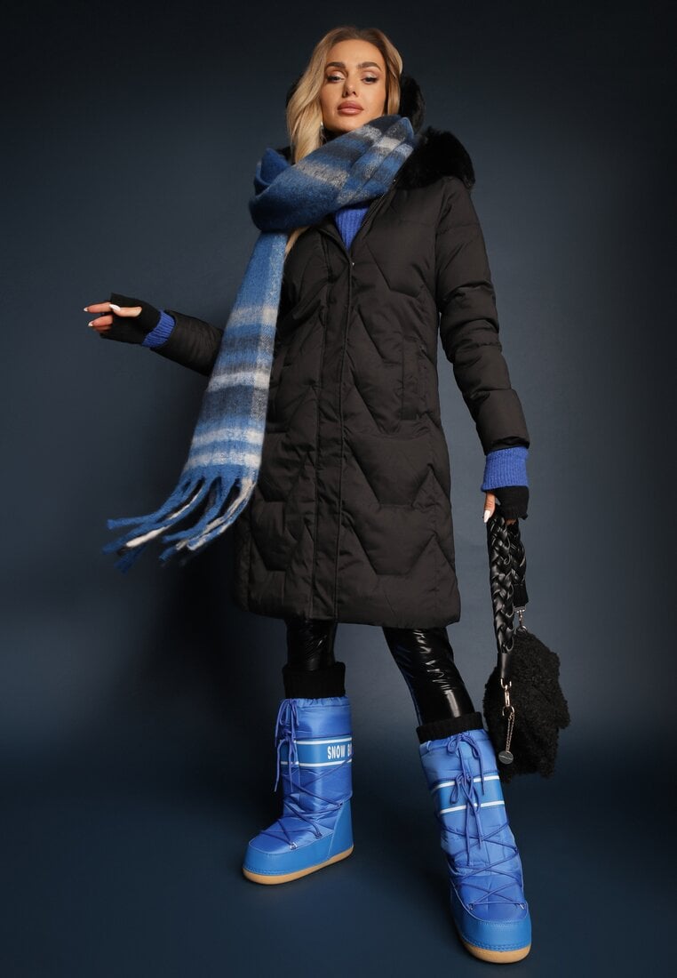 Geacă Neagră Lungă cu Cusături Matlasate Decorative cu Glugă și Blană Verticea