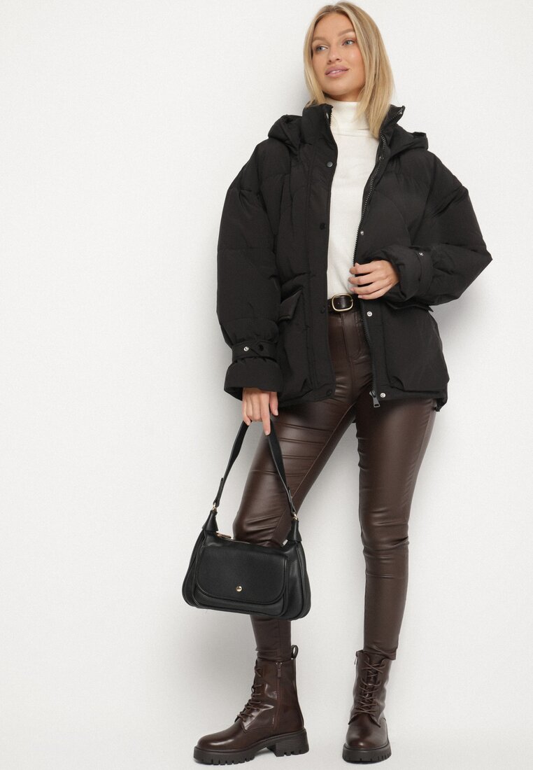 Geacă Neagră Matlasată Oversize cu Glugă și Curele la Mâneci Unitessa