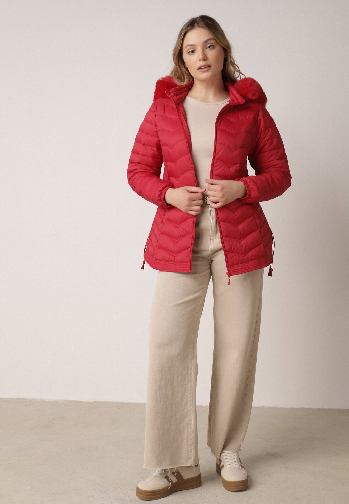 Geacă de tranziție roșie matlasată cu glugă și elastic la laterale Fezika