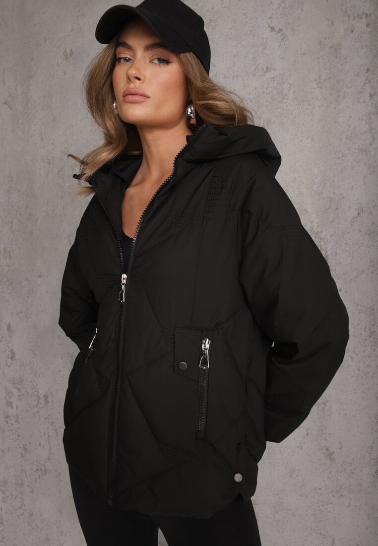 Jachetă Neagră cu Glugă Decorată cu Matlasare Lilora