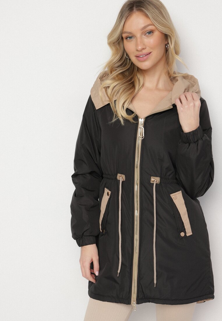 Jachetă Neagră Parka cu Glugă și Șnur în Talie Sizana