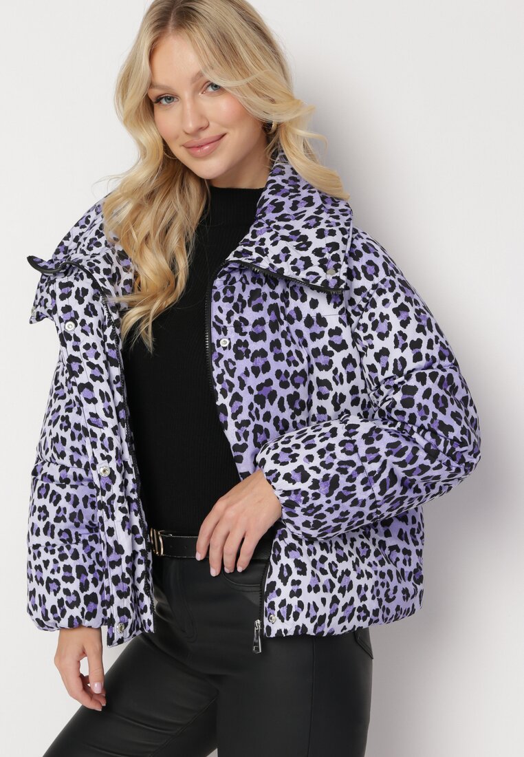 Jachetă violetă matlasată leopard cu guler înalt Baililla