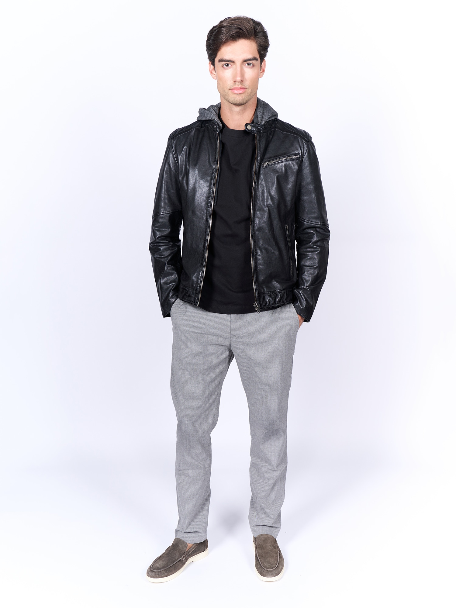 Design: Glugă cu șiret, Buzunare laterale cu fermoar; Tip de închidere: Fermoar; Modelul gecii: Geacă biker; Căptușeală: Căptușeală călduroasă; Material: Piele; Imprimeu: Monocrom; Detalii: Cusături ton în ton, Material rigid; Croi: Croi normal