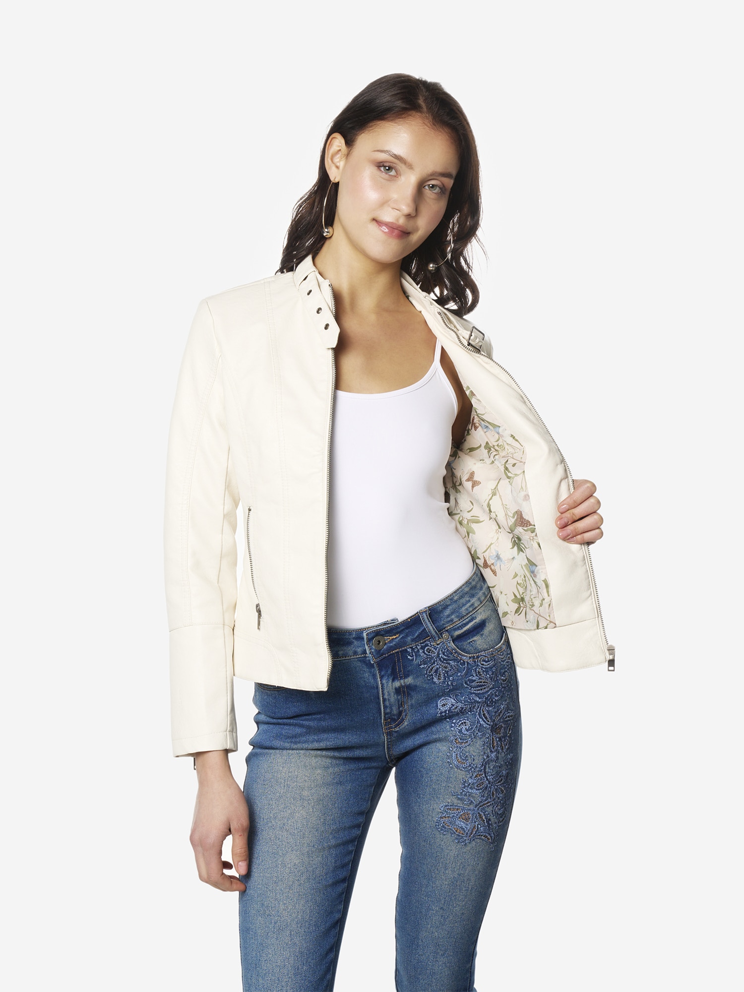 Design: Buzunare laterale cu fermoar; Tip de închidere: Fermoar; Modelul gecii: Geacă biker; Căptușeală: Căptușit parțial; Material: Imitație de piele; Imprimeu: Monocrom; Detalii: Material rigid; Croi: Croi mulat