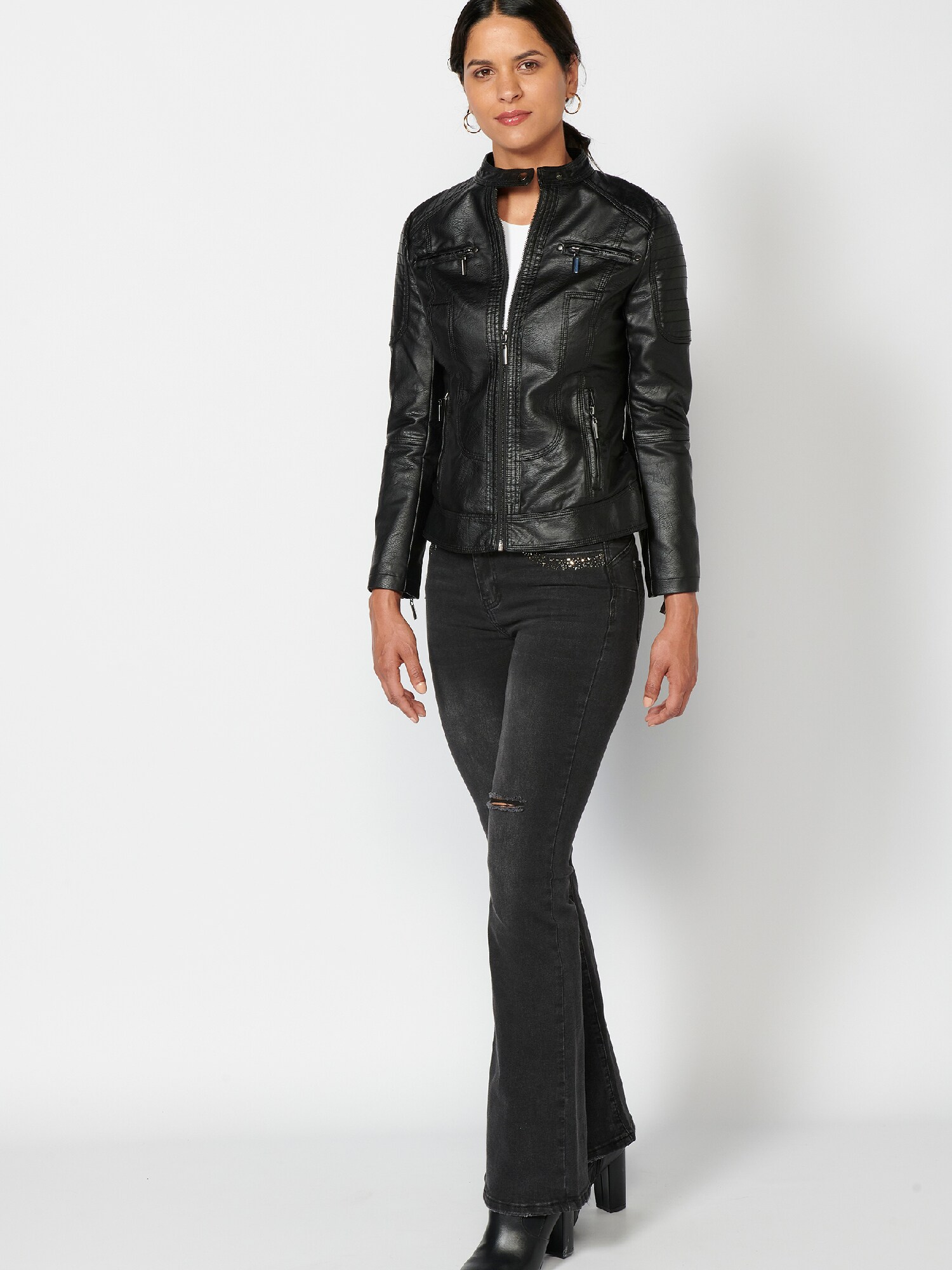 Tip de închidere: Fermoar; Modelul gecii: Geacă biker; Căptușeală: Necăptușit; Material: Imitație de piele; Imprimeu: Monocrom; Croi: Croi normal
