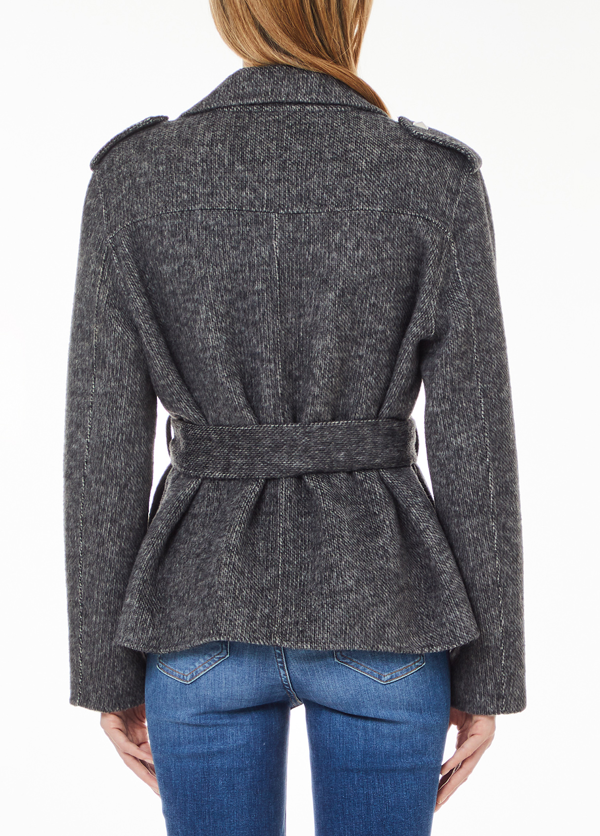 Wool-blend fabric biker jacket Lapel collar Tab details on the shoulders Zipped side pockets Matching colour belt with matching adjustable buckle Concealed snap button fastenings Lined
