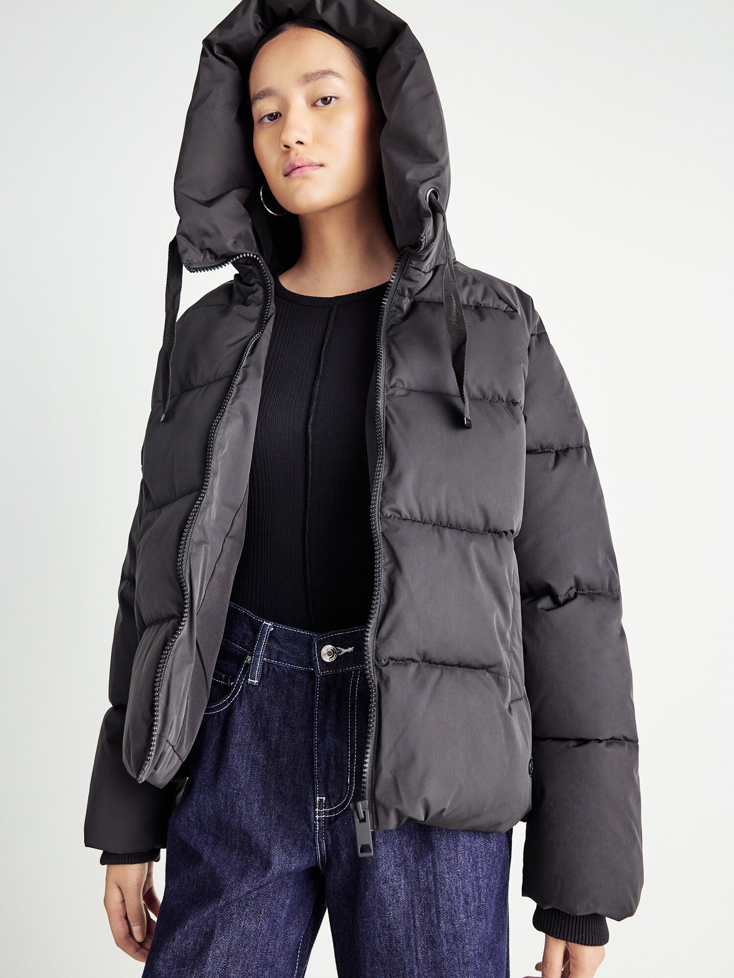 Design: Tiv drept, Guler tunică cu glugă, Glugă cu șiret, Mâneci raglan, Manșete cu striații, Buzunare laterale deschise; Tip de închidere: Fermoar; Modelul gecii: Geacă matlasată; Căptușeală: Căptușit cald; Imprimeu: Monocrom; Detalii: Matlasat, Cusături ton în ton, Efect prespălat, Material neted; Croi: Croi normal