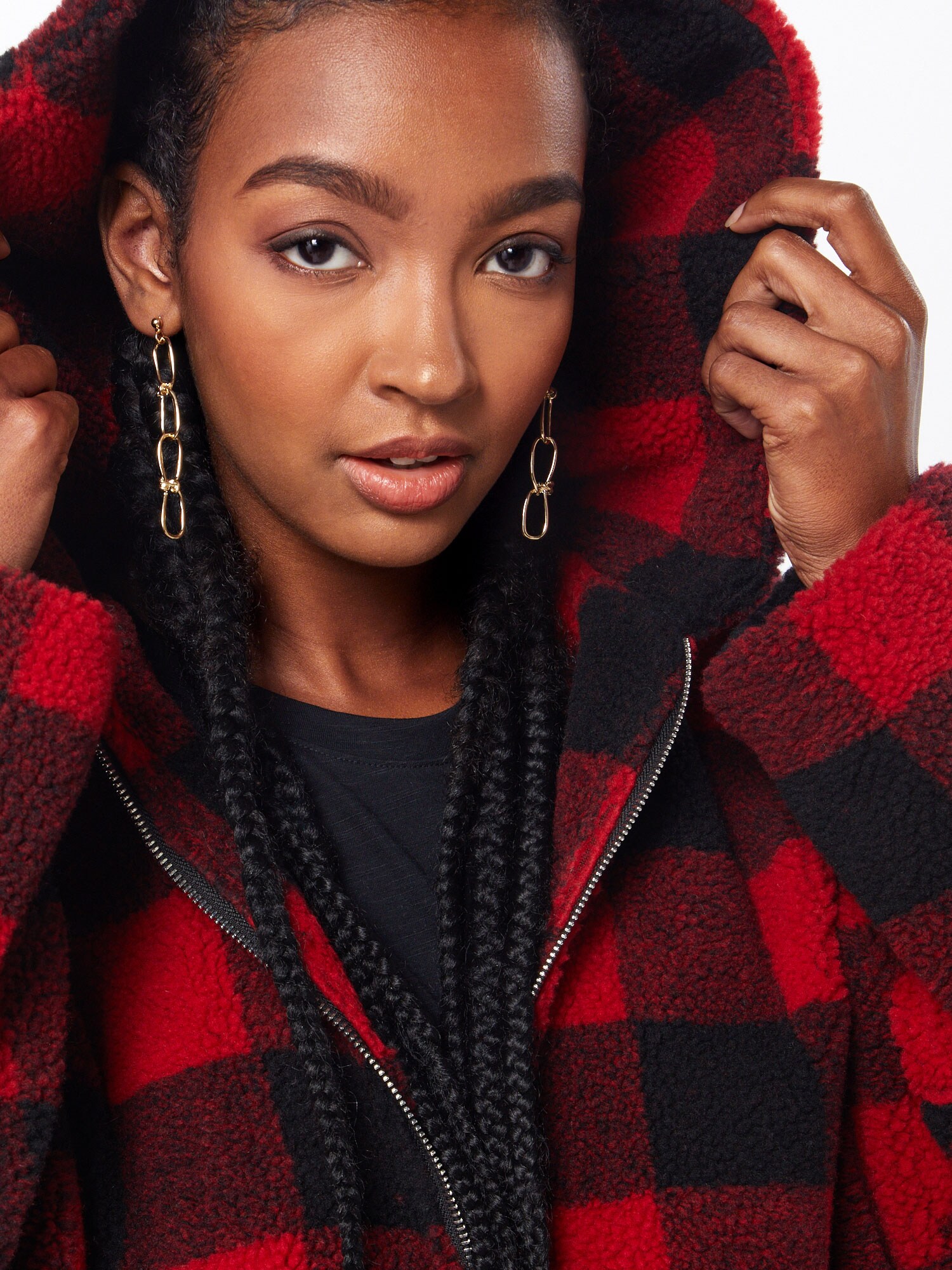 Urban Classics Geacă de primăvară-toamnă, fermoar, glugă, carouri, croi lejer, material structurat, culoare roșu rodie, rubiniu și negru