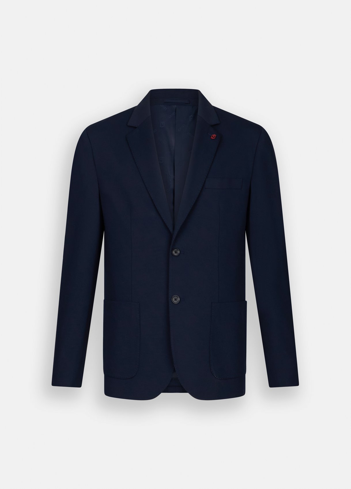 Blue viscose jersey blazer Classic lapels with removable pin Patch pockets Single-breasted closure