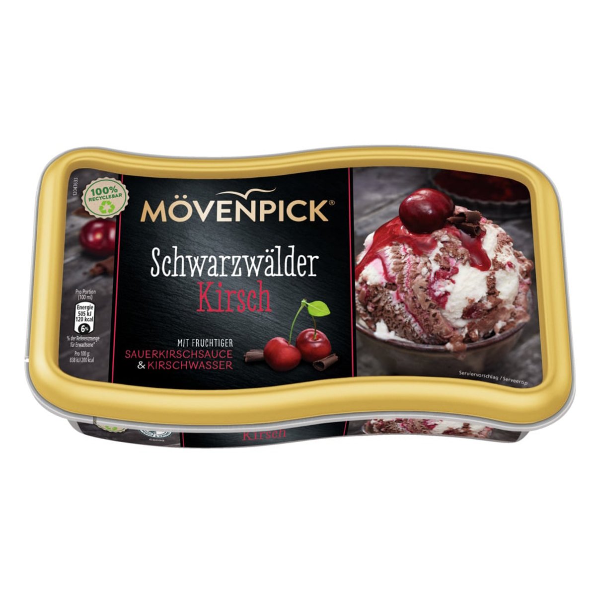 Movenpick inghetata de vanilie cu frisca si ciocolata, cu preparat din fructe cu bucati de cirese amare si cirese (12.1%) cu sos cirese (10,3%) si ciocolata rasa (0,7%)Produs congelat. A se depozita la -18 grade