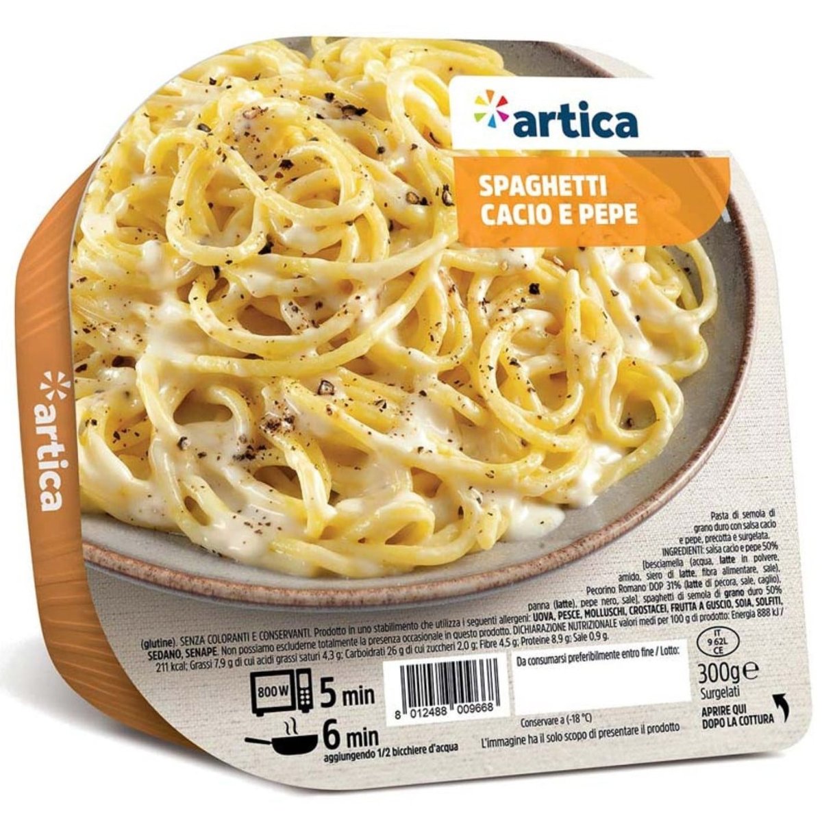 ARTICA Spaghete anghinare si piper Preparat gastronomic pe bază de paste din griș de grâu dur condimentat cu sos de brânză și piper negru, prefiert și congelat -18CSe gateste tigaie 7 min sau in cuptorul cu microunde 5 min la 900w