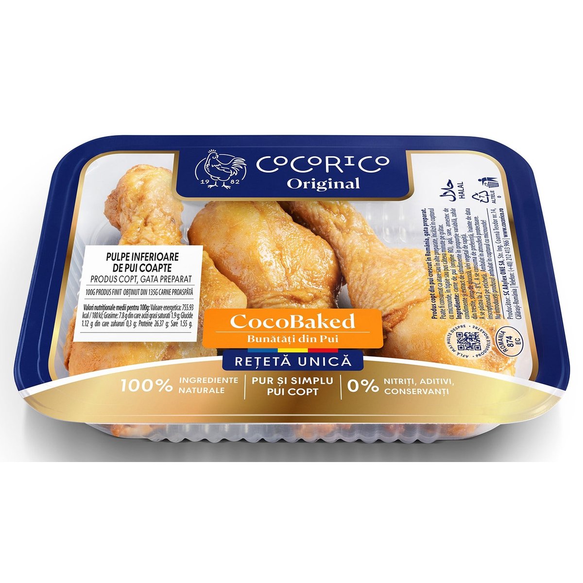Incearca noile CocoBaked din copanele de pui gata coapte, delicioase! Un produs 100% românesc, din pui proaspat Cocorico, hranit și crescut natural, pentru un aport ridicat de proteine, minerale și vitamine. Produse sanatoase și delicioase, marinate doar cu condimente naturale și-apoi coapte, dupa o rețeta unica, la cele mai Inalte standarde de calitate.Pot fi consumate ca atare, direct din pachet sau Incalzite In cuptorul cu microunde, In tigaie ori câteva minute pe gratar. Merg bine In orice moment al zilei, ca aperitiv, In salate, sandwich-uri sau alaturi de alte preparate, acasa sau la birou.FaRa: nitriți, aditivi, conservanți, monoglutamat de sodiu, arome artificiale, gluten. 2-8°CPoate fi consumat ca atare, incalzit in cuptorul cu microunde, in tigaie, sau pus cateva minute pe gratar.