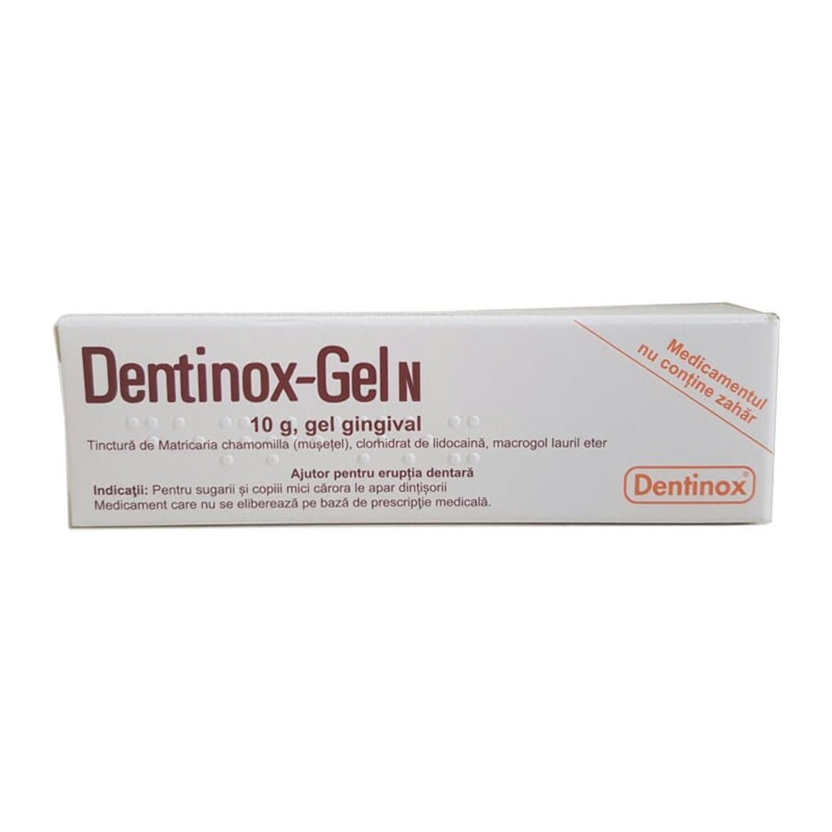 Compozitie. Substantele active sunt: tinctura de Matricaria chamomilla (musetel) 1500 mg, clorhidrat de lidocaina 34 mg, polidocanol 600 32 mg. Celelalte componente sunt: sorbitol solutie 70% (necristalizat)(Ph.Eur.), xilitol, propilenglicol, carbomer (974 P),hidroxid de sodiu solutie10%, polisorbat 20, edetat de sodiu (Ph.Eur.), levomentol, zaharina sodica, apa purificata. Indicatii terapeutice. Utilizat in mod traditional in tratamentul iritatiei, inflamatiei gingiilor si durerii provocate de eruptia dentara la copii in timpul aparitiei dentitiei primare. in cazul inrosirii sau umflarii grave a gingiei sau in cazul unor complicatii severe concomitente, va rugam sa luati legatura cu medicul dumneavoastra Doze si mod de administrare. Cand apar primele semne ale eruptiei dentare, aplicati o mica cantitate de Dentinox ¿ Gel N ( cat un bob de mazare) pe zona gingivala afectata cu ajutorul unui deget curat sau al unui betisor cu vata curat si masati usor. Aplicarea se repeta de 2 ¿ 3 ori pe zi, in special dupa mese si inainte de culcare. Dentinox-Gel N se aplica copiilor doar cand este cazul. Medicamentul se foloseste ocazional; poate fi folosit la eruptia tuturor dintilor de lapte, precum si la eruptia molarilor. Precautii. Spuneti medicului dumneavoastra sau farmacistului daca utilizati, ati utilizat recent sau s-ar putea sa utilizati orice alte medicamente, cu toate ca datorita caii de administrare este foarte putin probabila interactiunea Dentinox¿ Gel N cu alte medicamente. Atentionari speciale. Sarcina, alaptarea si fertilitatea Nu este cazul Conducerea vehiculelor si folosirea utilajelor Nu este cazul. Ambalaj. Dentinox-Gel N se prezinta sub forma de cutie cu un tub din aluminiu a 10 g gel gingival. Pagina actualizata la data de: 08.06.2021