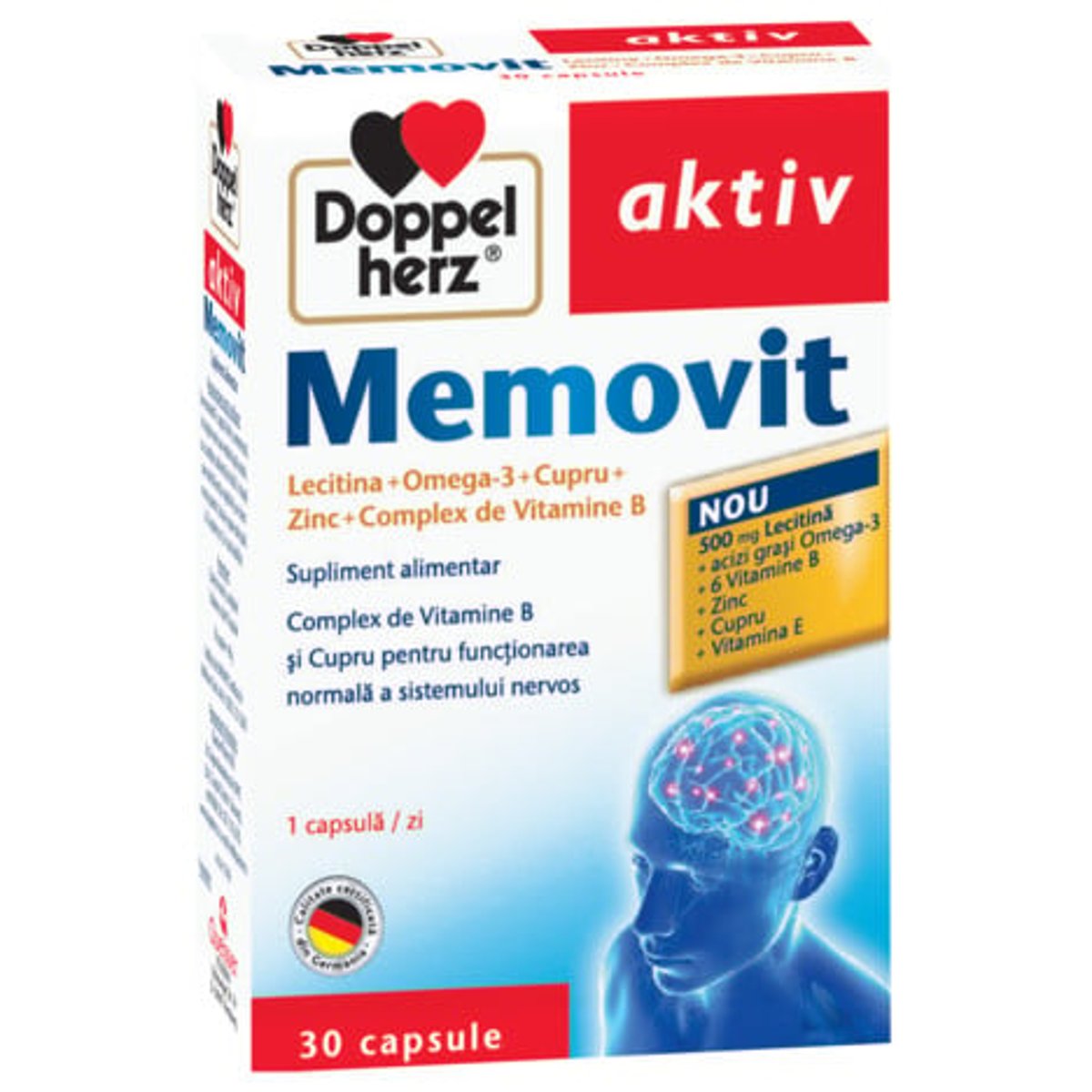 Capacitatea de concentrare si memoria sunt procese care pot fi antrenate si imbunatatite pe tot parcursul vietii. De aceea, este important sa stim ce ne ajuta in acest demers. Astfel, este utila practicarea unor activitati care solicita creierul in permanenta, tot asa cum muschii sunt antrenati in timpul activitatilor fizice. Este recomandat sa incercam sa invatam cel putin un lucru nou in fiecare zi, sa incepem cu efectuarea sarcinilor dificile si sa le lasam pe cele usoare la final, sa avem o viata ordonata. Lecitina este un amestec complex de fosfolipide diferite care intra in structura membranelor celulare, inclusiv a celor nervoase si cerebrale si le ofera proprietati fizico-mecanice specifice. Aportul de lecitina sta la baza constructiei membranelor celulare. De ce sunt atat de importante membranele celulare? Pentru ca proprietatile lor fizice sunt esentiale pentru modul in care semnalul nervos circula de-a lungul fibrelor nervoase si pentru comunicarea dintre neuroni la nivelul sinapselor. De asemenea, vitaminele hidrosolubile ale complexului B sunt esentiale pentru desfasurarea a numeroase procese din organism. Ele insa nu pot fi stocate pentru mult timp si, de aceea, un aport corect si constant este esential. Vitaminele complexului B (B1, B2, B6, B12, Niacina) contribuie la metabolismul energetic normal si la functionarea normala a sistemului nervos. Vitamina B1 si Acidul folic contribuie la mentinerea sanatatii psihice. Vitamina B6 contribuie la metabolismul normal al proteinelor si al glicogenilor si, alaturi de Niacina si Acid folic, la reducerea oboselii si extenuarii. Vitamina B12 contribuie la formarea normala a globulelor rosii, la functionarea normala a sistemului imunitar si la reducerea oboselii si extenuarii. Aportul de acizi grasi Omega-3 DHA (acid docosahexaenoic) si EPA (acid eicosapentaenoic) este si el important pentru sanatatea si starea de bine a organismului. Creierul contine 10-12% lipide, dintre care, aproximativ 35% sunt reprezentate de acizii grasi polinesaturati (Omega-3, Omega-6). DHA contribuie la mentinerea functiei normale a creierului, in conditiile unui consum zilnic de 250 mg. Vitamina E, care contribuie la protejarea celulelor impotriva stresului oxidativ. Zinc, care contribuie la functia cognitiva normala. Cupru, ce contribuie la functionarea normala a sistemului nervos. Doppelherz aktiv Memovit are o formula complexa, cu nutrienti care sprijina organismul prin: Functionarea normala a creierului si a sistemului nervos Sustinerea functiei cognitive normale Mentinerea sanatatii psihice Reducerea oboselii si extenuarii Protejarea celulelor impotriva stresului oxidativ Este, asadar, un supliment util in situatii precum: Stari de oboseala Stres in perioade solicitante din punct de vedere psihic si intelectual in timpul pregatirii examenelor Indicat Adolescentilor si studentilor in perioadele cu concursuri, examene Persoanelor active, solicitate din punct de vedere psihic si intelectual Persoanelor in varsta cu deficiente de memorie si concentrare Mod de administrare Se recomanda 1 capsula/ zi, nemestecata, in timpul mesei sau imediat dupa aceasta, cu o cantitate suficienta de lichid. in situatii care solicita functia cognitiva si un sistem nervos puternic, doza se poate mari pana la 2 capsule/ zi, in cazul adultilor. Compozitie Lecitina din soia 500 mg Acizi grasi Omega-3 90 mg DHA (Acid docosahexaenoic) 36 mg EPA (Acid eicosapentaenoic) 54 mg Vitamina E 10 mg Vitamina B1 1,4 mg Vitamina B2 1,6 mg Vitamina B12 1 mcg Niacina 13,5 mg NE Acid folic 200 mcg Zinc 2,5 mg Cupru 0,5 mg Atentionari A nu se depasi doza zilnica recomandata. Suplimentele alimentare nu inlocuiesc un regim alimentar variat si echilibrat sau un mod de viata sanatos. A nu se lasa la indemana si la vederea copiilor mici. A se pastra la temperaturi ce nu depasesc 25oC, in ambalajul original. A nu se administra persoanelor alergice la soia, peste sau la oricare dintre celelalte ingrediente ale produsului. A nu se administra copiilor cu varsta sub 12 ani.