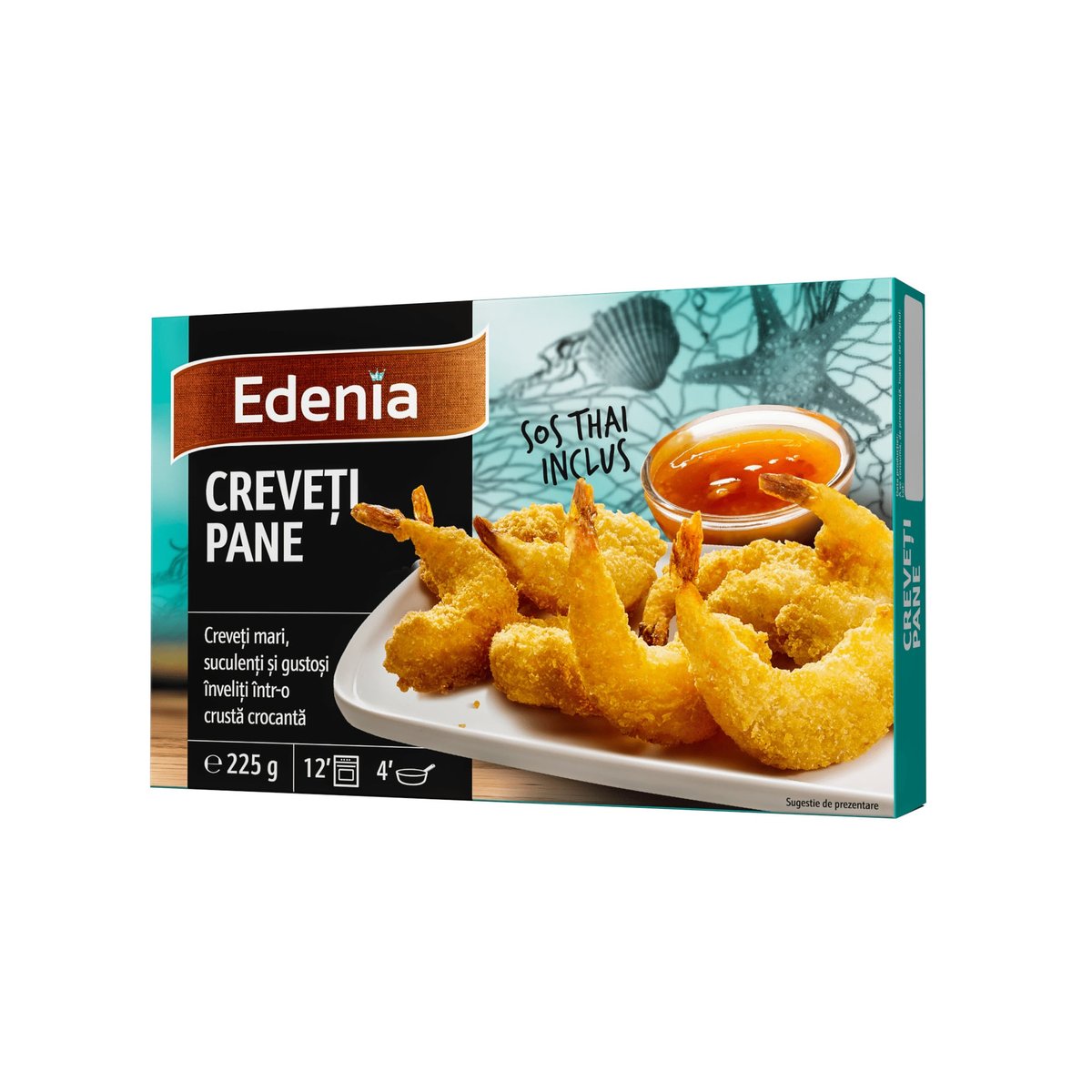 Creveti suculenti si gustosi, inveliti intr-o crusta crocanta. Specie: Litopenaeus vannamei.Instructiuni de prepararePreparare la cuptor:Preincalziti cuptorul la 220 °C. Asezati batoanele de peste congelate intr-o tava de cuptor tapetata cu hartie de copt si introduceti-o in cuptorul preincalzit, pe raftul de la centrul cuptorului. Coaceti-le aproximativ 15-17 minute, pana capata o culoare aurie. Dupa 10 minute intoarceti-le pe cealalta parte. Timpul de preparare poate varia in functie de tipul si performanta cuptorului.Preparare la tigaie:Puneti batoanele de peste congelate intr-o tigaie cu ulei incins si prajiti-le la foc mediu aproximativ 3-4 min, intorcandu-le pe ambele parti, pana capata o culoare aurie. Produsul nu se decongeleaza inainte de preparare!Conditii de depozitare+ 7 °C in frigider timp de 1 zi- 6 °C timp de 1 saptamana- 12 °C timp de 2 saptamani- 18 °C pana la data inscrisa pe ambalaj.