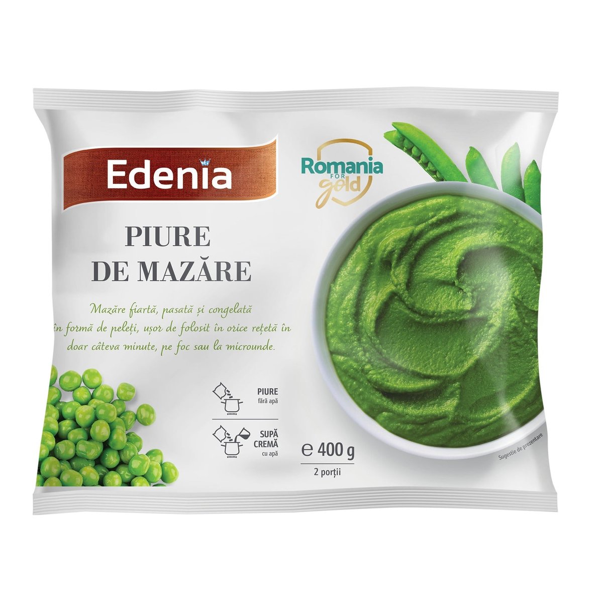 Mazare fiarta, pasata si congelata in forma de peleti, usor de folosit in orice reteta in doar cateva minute, pe foc sau la microunde. 5-7⁰C maximum 24 de ore; -18⁰C pana la data inscrisa pe ambalaj. A nu se recongela dupa decongelare!Produsul nu se decongeleaza inainte de preparare!Sugestie preparare:Piure: Oala: puneti peletii de mazare intr-o oala potrivita, la foc mediu si amestecati continuu pana la omogenizare. Asezonati dupa gust cu sare, piper, unt sau ulei de masline.Timp de preparare: pentru 200 g (1 portie) – 4 minute / pentru 400 g (2 portii) – 9 minute.Cuptor cu microunde: puneti peletii de mazare intr-un vas termorezistent cu capac si introduceti in cuptorul cu microunde la 900 W. La final amestecati si asezonati dupa gust cu sare, piper, unt sau ulei de masline.Timp de preparare: pentru 200 g (1 portie) – 4 minute / pentru 400 g (2 portii) – 7 minute.Supa crema:Oala: puneti peletii de mazare intr-o oala potrivita si adaugati cate 50 ml apa pentru fiecare 100 g peleti de mazare . Incalziti la foc mediu si amestecati continuu pana la omogenizare. Asezonati dupa gust cu sare, piper, unt sau ulei de masline. Timp de preparare: pentru 200 g (1 portie) – 4 minute / pentru 400 g (2 portii) – 9 minute.Cuptor cu microunde: puneti peletii de mazare intr-un vas termorezistent cu capac si adaugati cate 50 ml apa pentru fiecare 100 g peleti de mazare. Introduceti vasul in cuptorul cu microunde, la 900 W timp de 3 minute, apoi amestecati si incalziti inca 2 minute. La final amestecati si asezonati dupa gust cu sare, piper, unt sau ulei de masline.