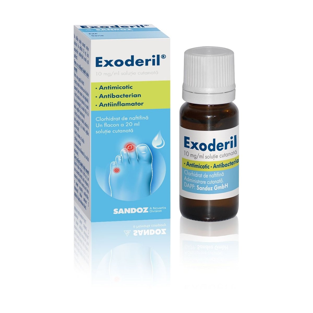 Exoderil solutie este indicat in infectiile fungice ale pielii si unghiilor.Se aplica local,o data pe zi,la recomandarea medicului sau farmacistului. Exoderil 10 mg/ml solutie cutanata (clorhidrat de naftifina) este un medicament folosit impotriva fungilor, cu utilizare la nivelul pielii. Este recomandat in tratamentul urmatoarelor infectii: - infectii micotice ale pielii sau ale pliurilor cutanate (tinea corporis, tinea inghinalis); - infectii micotice ale piciorului, in special la nivel interdigital, la nivelul talpii si la nivelul unghiilor (onicomicoze); - infectii micotice ale mainii, localizate la nivel interdigital si la nivelul unghiilor (onicomicoze); - infectii cutanate cu Candida; - Pitiriasis versicolor. Exoderil are, suplimentar fata de efectul antimicotic si o activitate antibacteriana asupra diferitelor microorganisme gram-pozitiv si gram-negativ, care pot sa apara frecvent asociate infectiilor fungice. Suplimentar, in cursul utilizarii clinice apare efect antiinflamator; acest efect conduce la ameliorarea rapida a semnelor inflamatorii, in particular a mancarimii. Nu utilizati Exoderil: - daca sunteti alergic (hipersensibil) la clorhidrat de naftifina sau la oricare din componentele Exoderil. Atentionari si precautii: Exoderil contine etanol si de aceea nu trebuie sa vina in contact cu ochii sau sa fie aplicat pe zone ale pielii cu leziuni. Daca sunteti gravida sau alaptati, credeti ca ati putea fi gravida sau intentionati sa ramaneti gravida, adresati-va medicului sau farmacistului pentru recomandari inainte de a lua acest medicament. Mod de administrare: Utilizati intotdeauna acest medicament exact asa cum v-a spus medicul sau farmacistul. Trebuie sa discutati cu medicul dumneavoastra sau cu farmacistul daca nu sunteti sigur. Exoderil se utilizeaza o data pe zi pe zona de piele afectata, dupa curatarea si uscarea in prealabil a acestei zone. Pentru a preveni recurentele, tratamentul trebuie continuat 2 saptamani dupa vindecarea clinica. Exoderil este folosit numai pentru aplicatii locale. In vederea vindecarii infectiei fungice (micoza) cat mai curand posibil va rugam sa luati in considerare urmatoarele aspecte: 1. Microbii pot adera la materialul textil realizand un contact cu aria cutanata infectata. De aceea, este necesara schimbarea zilnica a hainelor. 2. O piele normala si, in mod particular uscata, asigura o protectie buna in cazul infectiilor fungice. Se recomanda sa evitati acoperirea zonei de piele infectate cu imbracaminte stramta sau obiecte de imbracaminte care permit o ventilatie limitata sau care nu permit ventilatia (de exemplu ciorapi din fibre textile artificiale purtati in pantofi stramti). De asemenea, dupa spalare trebuie sa uscati bine zona infectata. Orice prosop sau imbracaminte trebuie schimbate zilnic. 3. In cazul piciorului de atlet nu trebuie sa mergeti descaltati acasa, in baie sau, de exemplu in hotel. Aceasta reprezinta calea prin care puteti preveni sa fiti reinfectati si sa preveniti raspandirea ulterioara a microbilor patogeni. 4. Sauna sau baile cu aburi trebuie frecventate numai dupa ce infectia fungica a fost vindecata definitiv. Cum se pastreaza Exoderil: Nu lasati acest medicament la vederea si indemana copiilor. A se pastra la temperaturi sub 30ºC, in ambalajul original. Nu utilizati Exoderil solutie cutanata dupa data de expirare inscrisa pe ambalaj. Data de expirare se refera la ultima zi a lunii respective. Nu aruncati niciun medicament pe calea apei sau a reziduurilor menajere. Intrebati farmacistul cum sa aruncati medicamentele pe care nu le mai utilizati. Aceste masuri vor ajuta la protejarea mediului. Mod de prezentare: 20ml
