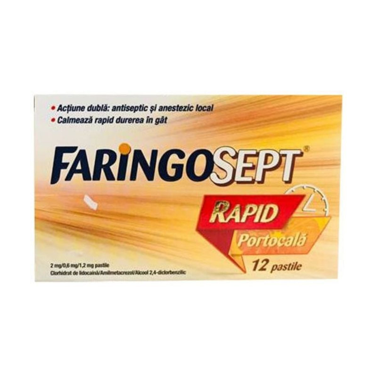 Compozitie Substantele active sunt: Clorhidrat de lidocaina 2,00 mg Amilmetacrezol 0,60 mg Alcool 2,4-diclorbenzilic 1,20 mg Indicatii terapeutice Faringosept Rapid contine amilmetacrezol si alcool 2,4-diclorbenzilic ¿ ambele antiseptice ¿ si clorhidrat de lidocaina ¿ un anestezic local pentru gat. Indicat pentru ameliorarea locala a simptomelor de durere ¿n gat la adulti si adolescenti cu varsta peste 12 ani. Daca dupa 2 zile nu va simtiti mai bine sau va simtiti mai rau, trebuie sa va adresati unui medic. Contraindicatii/Atentionari Trebuie sa-l informati pe medicul dumneavoastra daca: Aveti astm bronsic. Simptomele dumneavoastra nu se amelioreaza dupa doua zile sau aveti febra, dureri de cap, greata, varsaturi sau eruptie trecatoare pe piele. Doze si mod de administrare Utilizati intotdeauna exact asa cum v-a spus medicul dumneavoastra. Trebuie sa discutati cu medicul dumneavoastra sau cu farmacistul daca nu sunteti sigur. Dozele recomandate sunt urmatoarele: - Adulti si adolescenti cu varsta peste 12 ani: dizolvati lent in gura o pastila, o data la 2-3 ore, pana la maximum 8 pastile intr-o perioada de 24 ore (maximum 4 pastile pentru adolescenti). Nu lasati medicamentul sa se dizolve in sacul format la nivelul obrazului (intre obraz si dinti). Atentionari speciale Sarcina si alaptarea Daca sunteti gravida sau alaptati, credeti ca ati putea fi gravida sau intentionati sa ramaneti gravida, adresati-va medicului dumneavoastra sau farmacistului pentru recomandari inainte de a lua acest medicament. Conducerea vehiculelor si folosirea utilajelor Observati raspunsul dumneavoastra la acest medicament. Luat in doza recomandata, acest medicament nu ar trebui sa va afecteze reactiile sau sa cauzeze somnolenta. Cu toate acestea, daca observati oricare dintre aceste efecte, evitati sa conduceti vehicule sau sa folositi utilaje grele. Ambalaj Cutii cu blistere din PVC-PVDC/aluminiu care contin 12 pastile. Faringosept Rapid Portocala 2 mg/0,6 mg/1,2 mg pastile sunt pastile de culoare portocalie, biconvexe, de forma cilindrica, cu diametrul de 19 mm, cu aroma de portocale. Pagina actualizata la data de: 09.06.2021