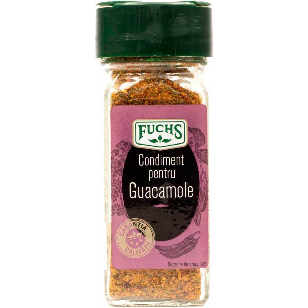 Ingrediente: condimente (ceapa, ardei rosu, coriandru,chilli, ghimbir, piper negru, chimion), sare 25%, zahar, acidifiant acid citric, patrunjel. Cantitate neta: 50gPoate contine urme de: faina de grau, oua, soia, lapte, telina, mustar, susan. A se pastra la loc uscat si racoros.Tara de origine: GermaniaDeclaratie nutritionala pentru 100g: Valoare energetica 1057Kj/251kcal; Grasimi 3.3g din care acizi grasi saturati 0.4g; Glucide 43.6g din care zaharuri 29.9g; Proteine 6.4; Sare25.01gReteta noastra de Guacamole:Pasati 35 g de avocado bine copt( aproximativ 2 bucati mari) si amestecat-l cu o rosie si 1 ceapa rosie mica tocate foarte marunt. Adaugati 25g din acest condiment si putin suc de lime proaspat stors.Pentru reteta detaliata vizitati www.fuchs.roA se pastra la loc uscat/intunecat si racorosse dozeaza dupa gust sau dupa reteta proprie