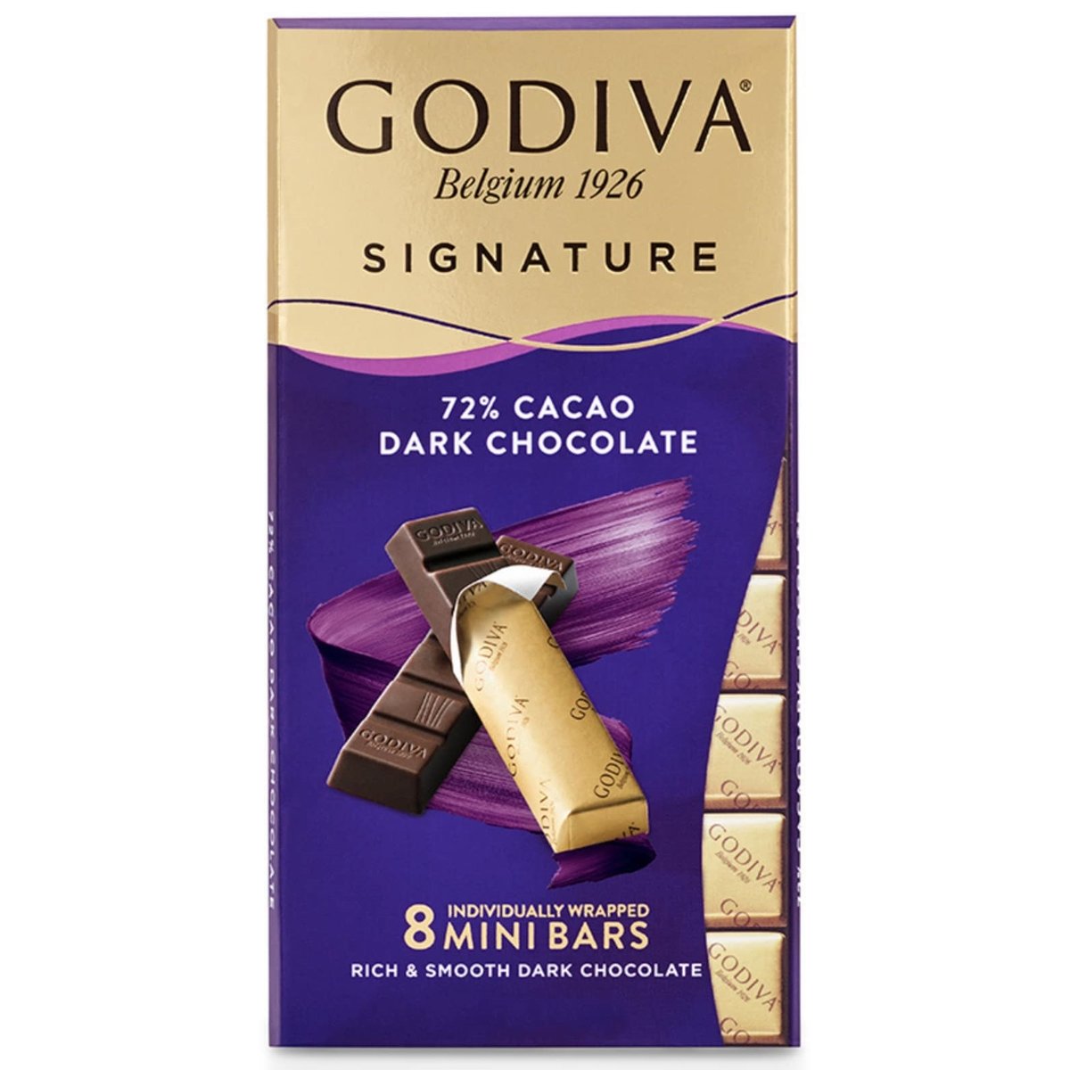 Godiva Mini Bars reprezinta o noua abordare a tabletelor de ciocolata premium. Ingredientele prajite si amestecate la perfectiune ofera o textura luxoasa si o aroma bogata ciocolatei. Fiecare Godiva Signature Mini Bars contine opt batoane perfect portionate de ciocolata, ambalate individual in folie aurie. Astfel, pot fi savurate oriunde si oricand, acasa sau on the go, singur sau impreuna cu cei dragi.Godiva Mini Bars 72% Cocoa este o ciocolata neagra cu gust intens, ce ofera o experienta de gust de lux.A se pastra la o temperatura intre 12-18°C.