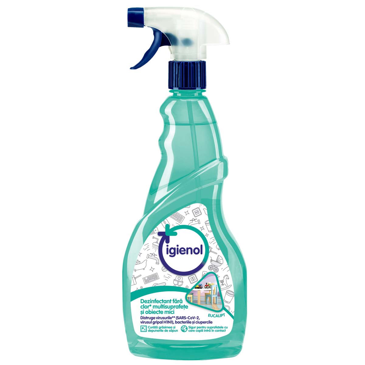 IGIENOL DEZINFECTANT SUPRAFETE MICI EUCALIPT 750 MLCu o forma practica, usor de utilizat datorita pompei cu care produsul este prevazut, Igienol dezinfecteaza in siguranta suprafetele mici si obiectele din casa. Inactiveaza 99,9% dintre virusurile* (SARS-CoV-2, Coronavirus, Virusul Gripal Influenza H1N1,Vaccinia virus, HIV, Herpesviridae) si bacteriile testate* (Staphylococcus aureus, Pseudomonas aeruginosa, E. coli, Enterococcus hirae, Canida albicans), dizolva grasimea si depunerile de sapun, pentru o curatenie rapida si fara efort. Produsul poate fi folosit pe orice suprafata mica sau obiect din baie, bucatarie, dormitor, cum ar fi capacul WC, vas WC, olita, clante, tastatura, mouse, intrerupator, galeata de gunoi, robineti, dus, etc. Este sigur de folosit pe orice suprafata mica, inclusiv pe lemnul nelacuit. Lasa suprafetele stralucitoare, parfumeaza placut, nu lasa urme, se usuca rapid si are un efect anti-remurdarire.Produsul este avizat de Ministerul Sanatatii (Comisia Nationala pentru Produse Biocide). Produs fabricat in Romania.*Conform testelor de eficacitate efectuate de laboratoare independente.Pulverizati lichidul ca atare direct pe suprafata dorita de la o distanta de 20-25 cm. Lasati sa actioneze 5 minute, apoi stergeti cu o laveta curata si clatiti bine cu apa.Actiune bactericida, levuricida si inactivare virusuri: timp de actiune 5 minute. Folositi produsul direct pe suprafetele dorite fara a curata in prealabil.