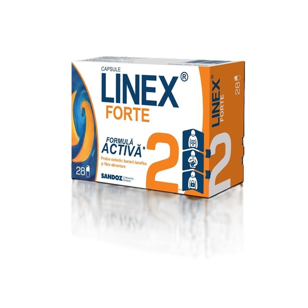 LINEX® FORTE este un sinbiotic modern care contine doua tulpini de bacterii ce se regasesc natural in flora noastra intestinala, din genurile Lactobacillus si Bifidobacterium, cat si un complex de fibre vegetale(inulina si oligofructoza). LINEX® Forte este un produs sinbiotic care contine 2 tulpini de bacterii liofilizate, special selectate din genurile Lactobacillus si Bifidobacterium, precum si Beneo® Synergy, un complex unic de inulina si oligofructoza. LINEX® Forte contine Lactobacillus acidophilus si Bifidobacterium animalis subsp. lactis, tulpini lactice bine cunoscute si intens cercetate, care suplimenteaza flora intestinala atat la adulti cat si la copii. Bacteriile lactice sunt prezente in mod natural in intregul tract intestinal, unde indeplinesc numeroase functii importante legate de integritatea mucoasei intestinale, digerarea alimentelor (scindarea proteinelor), etc. Tulburarea echilibrului microflorei intestinale poate fi provocata de mai multi factori, printre care: • tratamentul cu antibiotice • infectiile intestinale bacteriene sau virale (de exemplu, cu Rotavirus) • calatoriile (diareea sau constipatia calatorului) • stresul. Dezechilibrul florei intestinale a fost asociat cu aparitia unor simptome de tipul: balonare, tulburari de tranzit intestinal, disconfort abdominal, eruptii cutanate, ca urmare a afectarii imunitatii organismului. Beneo® Synergy este un complex de fibre de origine vegetala (inulina si oligofructoza) care nu sunt digerate de organism, dar favorizeaza dezvoltarea bacteriilor benefice acestuia si aduc numeroase beneficii consumatorului. Utilizarea de Lactobacillus acidophilus si Bifidobacterium animalis subsp. lactis din compozitia LINEX® Forte este benefica pentru suplimentarea florei intestinale. Mod de administrare: Copii cu varsta intre 3 si 12 ani: cate o capsula de 1-2 ori pe zi. Adulti si copii cu varsta de peste 12 ani: cate o capsula de 1-3 ori pe zi. Pentru a evita distrugerea bacteriilor, nu amestecati pulberea din capsula cu bauturi calde. Mod de prezentare: 28 capsule
