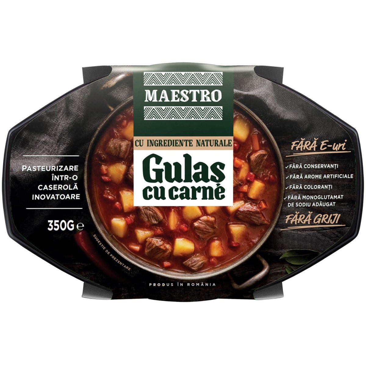 Gulașul cu carne de la Maestro este preparat cu ingrediente naturale, fără coloranți, fără conservanți, fără arome artificiale și fără monoglutamat de sodiu adăugat.Gulașul cu carne de la Maestro poate constitui un fel principal sățios, chiar pentru două persoane, fiind ușor de folosit, la birou, pe drum sau chiar acasă.Experiență culinară memorabilă si gust delicios intr-o reteta de mancare din bucătăria românească.Pasteurizat și ambalat printr-o tehnologie revolutionara si inovatoare, care permite păstratea prospețimii rețetelor timp îndelungat. Sugestie de utilizare: Produsul se consuma ca atare sau încalzit în cuptorul cu microunde.Îndepartati mansonul de carton al caserolei, încalziti preparatul 3 - 4 minute în cuptorul cu microunde(700 W), pâna se aude semnalul sonor (fluierat), dupa care dezlipiti folia protectoare a caserolei.Daca încalziti continutul caserolei pe plita/în cuptorul electric/cu gaz, îndepartati în prealabil ambalajul (caserola si folia protectoare a acesteia).Dupa îndepartarea foliei cu care este sigilata caserola, a se pastra la temperatura de 2°- 8° C si a se consuma în maximum 24 ore.