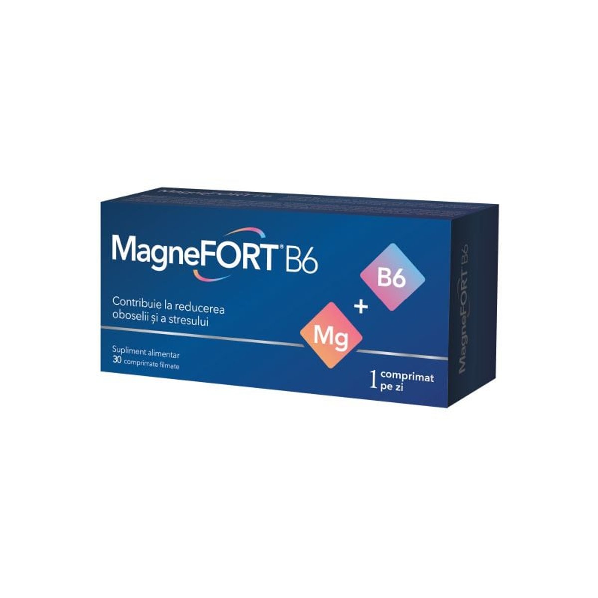 Magneziul este un mineral indispensabil vietii celulelor, aproximativ jumatate din continutul de magneziu prezent in organism fiind localizat in interiorul celulelor. Restul se regaseste la nivelul tesutului osos, in combinatie cu calciul si fosforul. Element necesar pentru mai mult de 300 de reactii biochimice din organism, magneziul contribuie la metabolismul energetic normal, la functionarea normala a sistemului nervos si muscular. Participa la procesul de diviziune celulara, la sinteza normala a proteinelor, la echilibrul electrolitic si contribuie la mentinerea sanatatii psihice, a sistemului osos si a dintilor. De asemenea, contribuie la reducerea oboselii si extenuarii. Vitamina B6 contribuie la sinteza normala a cisteinei, la metabolismul normal al homocisteinei, al proteinelor si al glicogenilor. De asemenea, contribuie la formarea normala a globulelor rosii, la reglarea activitatii hormonale si la functionarea normala a sistemului imunitar. Ingrediente: Fiecare comprimat filmat contine oxid de magneziu 500 mg (corespunzator la 300 mg magneziu), agenti de incarcare (celuloza microcristalina 102, lactoza monohidrat direct comprimabila), film de acoperire (contine: copolimer grefat de alcool polivinilic si plietilenglicol, talc, carbonat de calciu, mono - si digliceride ale acizilor grasi, alcool polivinilic partial hidrolizat, carmin indigo), agent de afanare (carboximetilceluloza de sodiu), agenti antiaglomeranti (acizi grasi, talc, dioxid de siliciu coloidal anhidru), 1,4 mg vitamina B6 (clorhidrat de piridoxina). Mod de utilizare: Pentru adulti: 1 comprimat pe zi.
