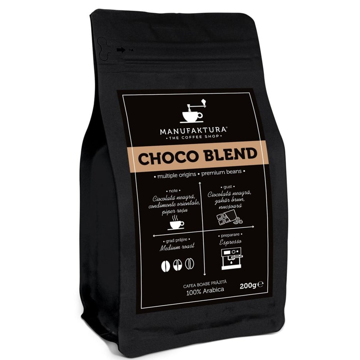 Descopera gama de cafea boabe Manufaktura, o calatorie senzoriala prin cele mai exotice regiuni ale lumii. Manufaktura creeaza o experienta totala pe care o poti impartasi cu prietenii, colegii sau familia in timp ce serviti o cafea de origine de cea mai buna calitate, recoltata din cele mai recunoscute plantatii care certifica calitatea superioara a cafelei . Manufaktuta Chocolate Blend, este o cafea boabe, origine cafea Brazilia, Columbia, India, Note: ciocolata neagra, condimente orientale,piper rosu, Gust:ciocolata neagra,zahar brun, nucsoaraTemperatura ambientala. A se pastra la loc uscat si racoros.espresso