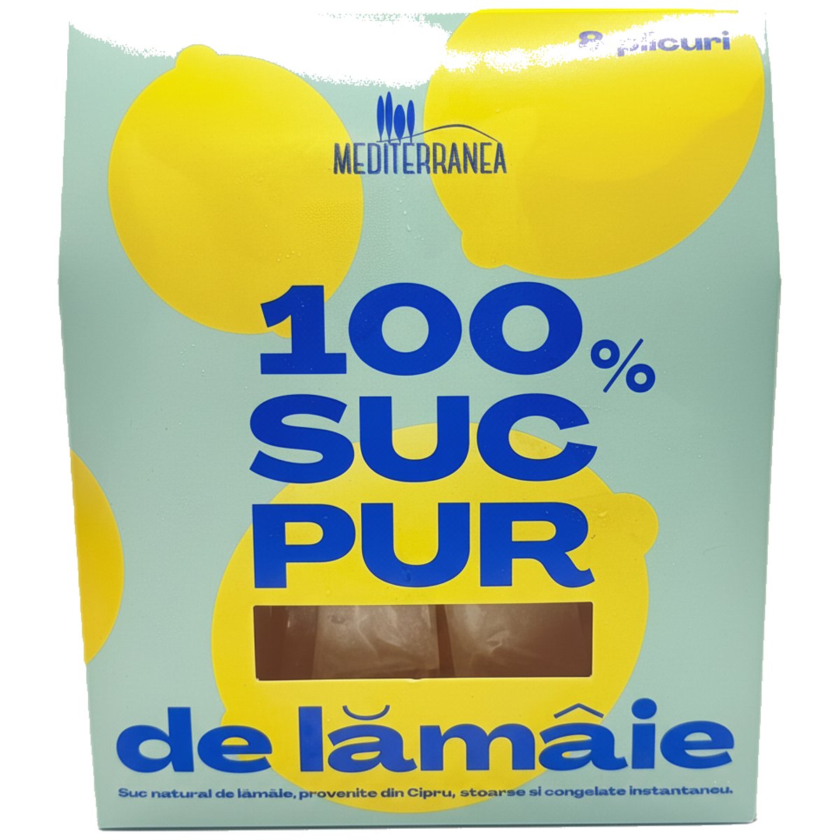 MEDITERRANEA Suc de lamaie,100% pur,congelat. Dupa recoltarea lamailor cipriote , una dintre cele mai bune tipuri de lamaie, lamaile sunt storse si congelate instantaneu pentru a se pastra proprietatile sucului, neadaugandu-se absolut niciun conservant/aditiv. Ceea ce se obtine este cel mai bun suc de lamaie pe care-l puteti utiliza pentru gatit, prepararea cocktail-urilor sau pentru o limonada delicioasa. Se desface cutia, se scoate plicul de plastic din interior, se rupe/taie plicul de plastic, ulterior se foloseste continutul. Un plic contine 25 g suc lamaie pur. Reteta propusa pentru o limonada delicioasa - 50 g suc de lamaie ( continutul a 2 plicuri ), se adauga zahar (aprox 15 gr) sau miere dupa gust, 300 ml apa plata sau carbogazoasa in functie de preferinte, se asezoneaza dup