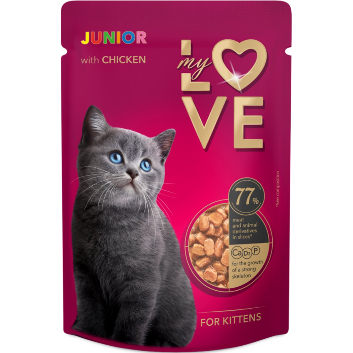 My Love Hrana completa conservata pentru pisoi, 85gIngrediente: carne si produse derivate de origine animala (bucatele in proportie de cel putin 77 %), inclusiv carne de gaina cel putin 8 %, cereale (grau 6 %), extracte de proteine vegetale, substante minerale, produse derivate de origine vegetala (patrunjel) 0,001 %.Constituenti analitici: proteine brute - 8 %, grasimi brute - 5,2 %, cenusa bruta - 2,5 %, celuloza bruta - 0,3 %, umeditate - 80 %, calciu - 0,35 %, fosfor - 0,25 %.Aditivi (per 1 kg de hrana): vitamina D3 (3а671): 203 UI; vitamina E (3а700): 13,5 mg, vitamina B1 (3а821): 1 mg, acid folic (3a316): 0,26 mg, taurina (3а370): 534 mg, clorura de colina (3a890) 60 %: 1,26 g; compusi de oligoelemente: zinc (sulfat de zinc heptahidrat 3b604): 3 mg, mangan (sulfat de mangan monohidrat 3b503): 0,7 mg, iod (iodura de potasiu 3b201): 0,32 mg, seleniu (selenit de sodiu 3b801): 0,2 μg.Aditivi tehnologici: guma tara (E412): 1,1 g; guma xantan (E415): 0,3 g.Aditivi senzoriali: colorant, glicina (2b17034): 2,9 g.Valoarea energetica (calorii) per 100 g de hrana: 347,26 kJ (83 kcal).