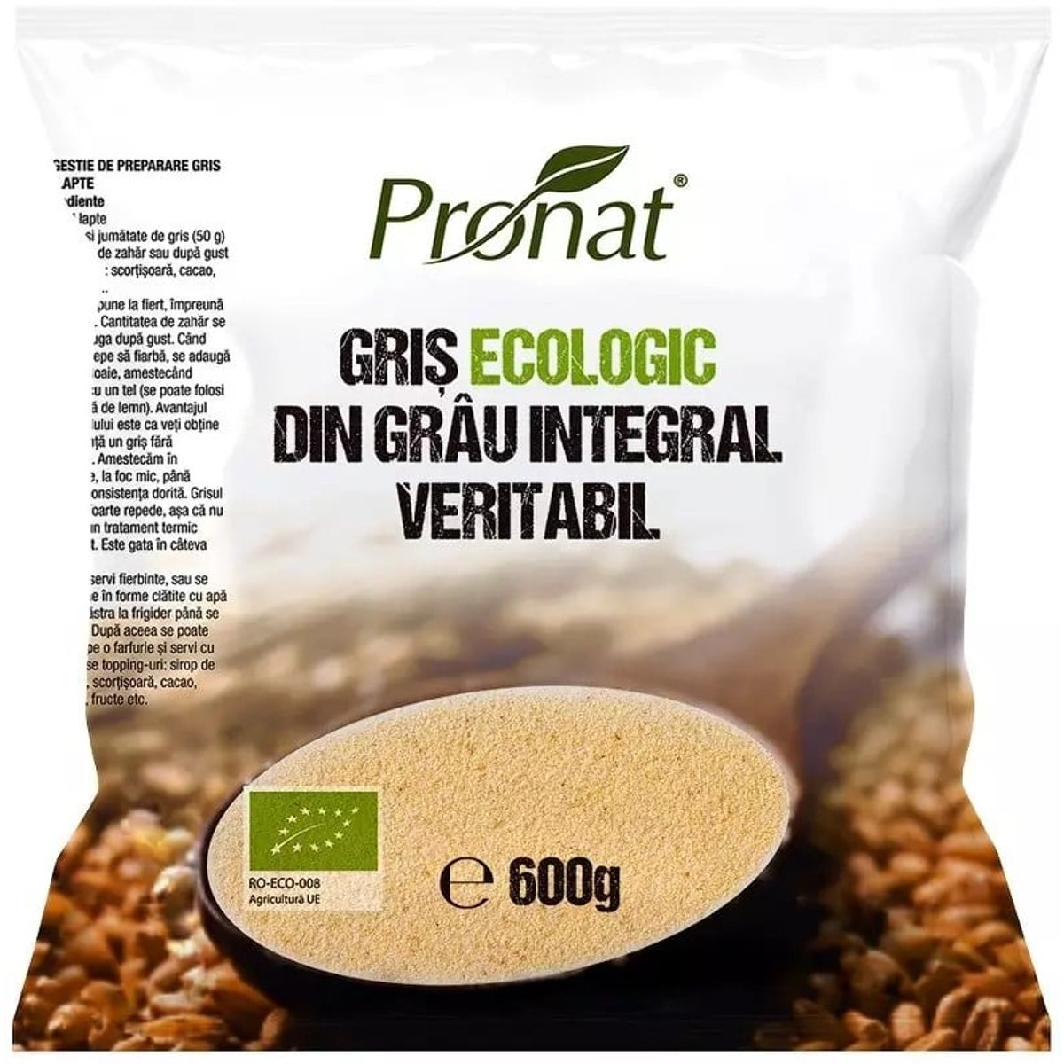 Gris Bio din grau integral veritabil, 600gReuneşte în mod ideal avantajele unei hrăniri integrale: un conţinut ridicat de fibre şi cantităţi mari de fosfor şi potasiu, iar conţinutul de acizi graşi esenţiali şi de minerale este mai ridicat decât la alte cereale.- conţine antioxidanţi, ce ne protejează celulele de acţiunea negativă a radicalilor liberi;- are un conţinut ridicat de fibre, ce facilitează tranzitul intestinal şi previne constipaţia;- ajută la prevenirea bolilor cardiovasculare;- protejează pielea împotriva îmbătrânirii premature, cu ajutorul antioxidanţilor;- ajută la prevenirea cancerului, în special cel de colon cu ajutorul fibrelor;- conţine octacosanol ( nutrient) benefic în regimurile de slăbire, deoarece ajută la îmbunătăţirea reflexelor corpului;- ajută la îmbunătăţirea proceselor de utilizare a oxigenului de către organism;- creşte abilitatea corpului de a face faţă stresului;- ajută la echilibrarea metabolismului;- protejează muşchii, sângele, plămânii şi ochii;- ajută la prevenirea cheagurilor de sânge şi contribuie la întărirea sistemului imunitar;- conţine acid folic, ce ajută la scăderea nivelului de hemocisteină, astfel prevenindu-se deteriorarea arterelor;- vitamina B din grâu ajută la digestie, la repararea tesuturilor şi menţine pielea sănătoasă;Ingrediente: griş integral din grâu**din culturi certificate ecologicValori nutriţionale/100 g:Valoare energetică 339 kcal/1434 kJGrăsimi 1,2 g-din care acizi graşi saturaţi 0,3 gCarbohidrați 69,4 g-din care zaharuri 2,1 gFibre alimentare 7,2 gProteine 9gSare 0,007 gCondiţii de păstrare: loc uscat şi răcorosSe poate utiliza pentru griş cu lapte, budici, papanaşi, găluşte cu prune, prăjituri şi patiserii sau ca ingredient pentru supe.Termen de valabilitate: a se vedea data inscripționată pe ambalaj/etichetă.Origine: RomaniaDistribuitor: S.C. PRONAT S.R.L.