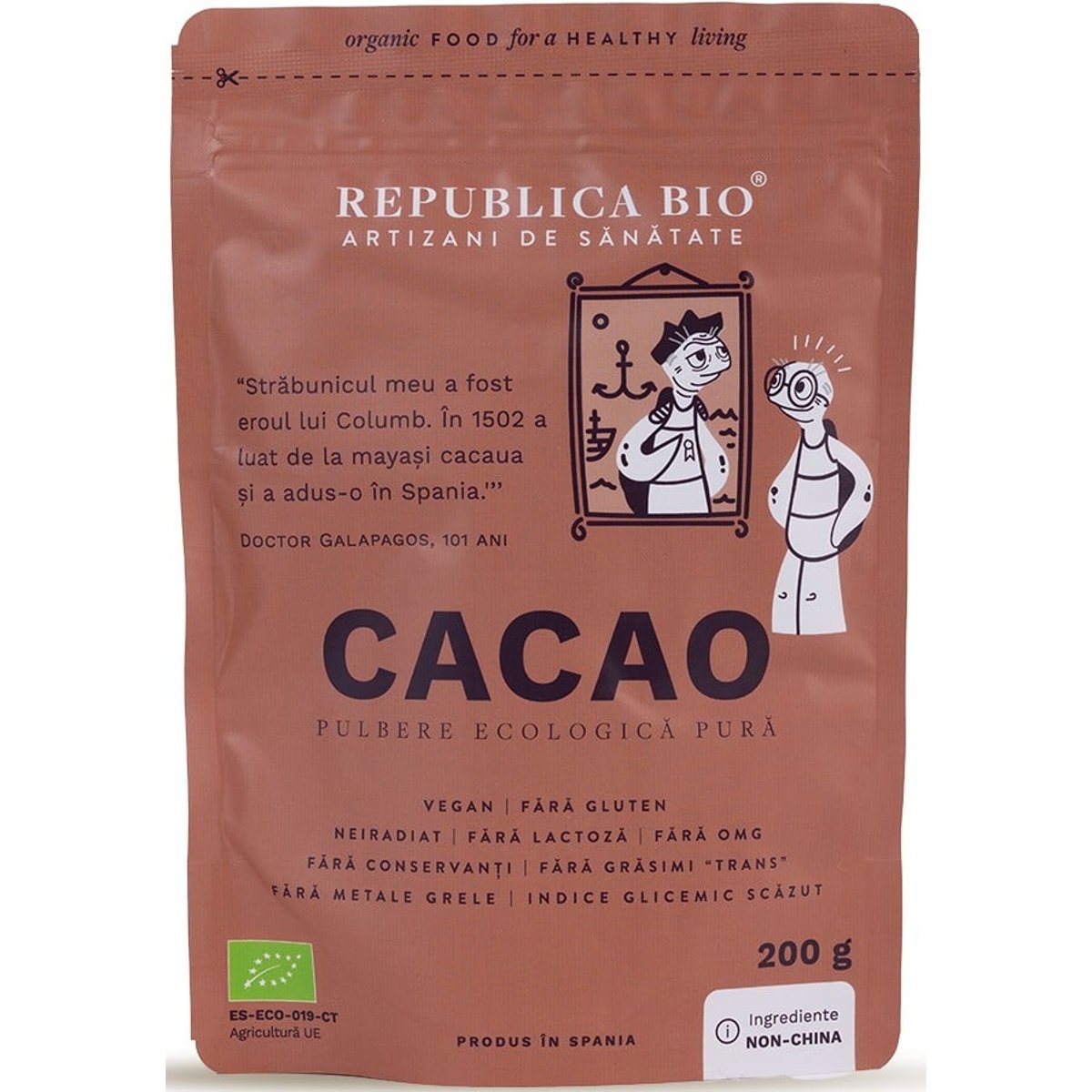 De ce sa alegi produsul?• Certificat ecologic: Produs conform standardelor stricte ale Uniunii Europene pentru agricultura ecologica, fara organisme modificate genetic si neiradiat.• Fara alergeni: Fara urme de gluten, lactoza, nuci, soia sau alti alergeni, potrivit pentru diete speciale.• Testat fizico-chimic: Verificat impotriva pesticidelor, metalelor grele si contaminantilor.• Ambalat intr-o fabrica fara gluten: Produsul este ambalat intr-o unitate ce nu proceseaza gluten, garantand lipsa contaminarii incrucisate.Ideal pentru:• Persoane active: Cacaua stimuleaza sistemul nervos, imbunatatind energia si capacitatea de concentrare.• Cei care doresc sa-si imbunatateasca starea de spirit: Cacaua ajuta la eliberarea endorfinei si serotoninei, contribuind la o stare generala de bine.• Iubitorii de ciocolata: O alternativa sanatoasa pentru prepararea ciocolatei calde sau in deserturi, fara zahar adaugat.• Persoane cu sensibilitati alimentare: Potrivit pentru cei cu intolerante sau alergii, fiind un produs fara alergeni, fara gluten si lactoza.Beneficii cheie:• Energie naturala: Cacaua este un tonic natural care poate inlocui cafeaua fara a provoca dependenta.• Sursa bogata de antioxidanti: Cacaua contine antioxidanti care sprijina sanatatea celulara si protejeaza impotriva stresului oxidativ.• Minerale esentiale: Bogata in fier, magneziu si sulf, contribuie la sanatatea pielii, parului si unghiilor.• Imbunatateste starea de spirit: Cacaua stimuleaza eliberarea hormonilor fericirii, oferind un potential efect antidepresiv si afrodiziac.• Dupa deschidere, pastreaza produsul la temperatura camerei, in punga bine inchisa, ferit de umiditate si razele directe ale soarelui.• Mod de utilizare: Foloseste pudra de cacao pentru a pregati ciocolata calda, adauga in shake-uri, smoothie-uri sau bauturi vegetale.• Alte utilizari: Adauga 1/2 lingurita peste cerealele de la micul dejun (de preferat ovaz) sau in deserturi.• Gatire optima: Cacaua elibereaza mai multi antioxidanti cand este incalzita. Combina cacaua cu lapte si fierbe compozitia timp de 2-3 minute.• Indulcire: Poti indulci cu zahar de cocos sau indulcitorul preferat pentru un gust dulce si sanatos.• Doza recomandata: Nu depasi 4-5 lingurite (aproximativ 20g pe zi). Consuma in special dimineata pentru efectul energizant.