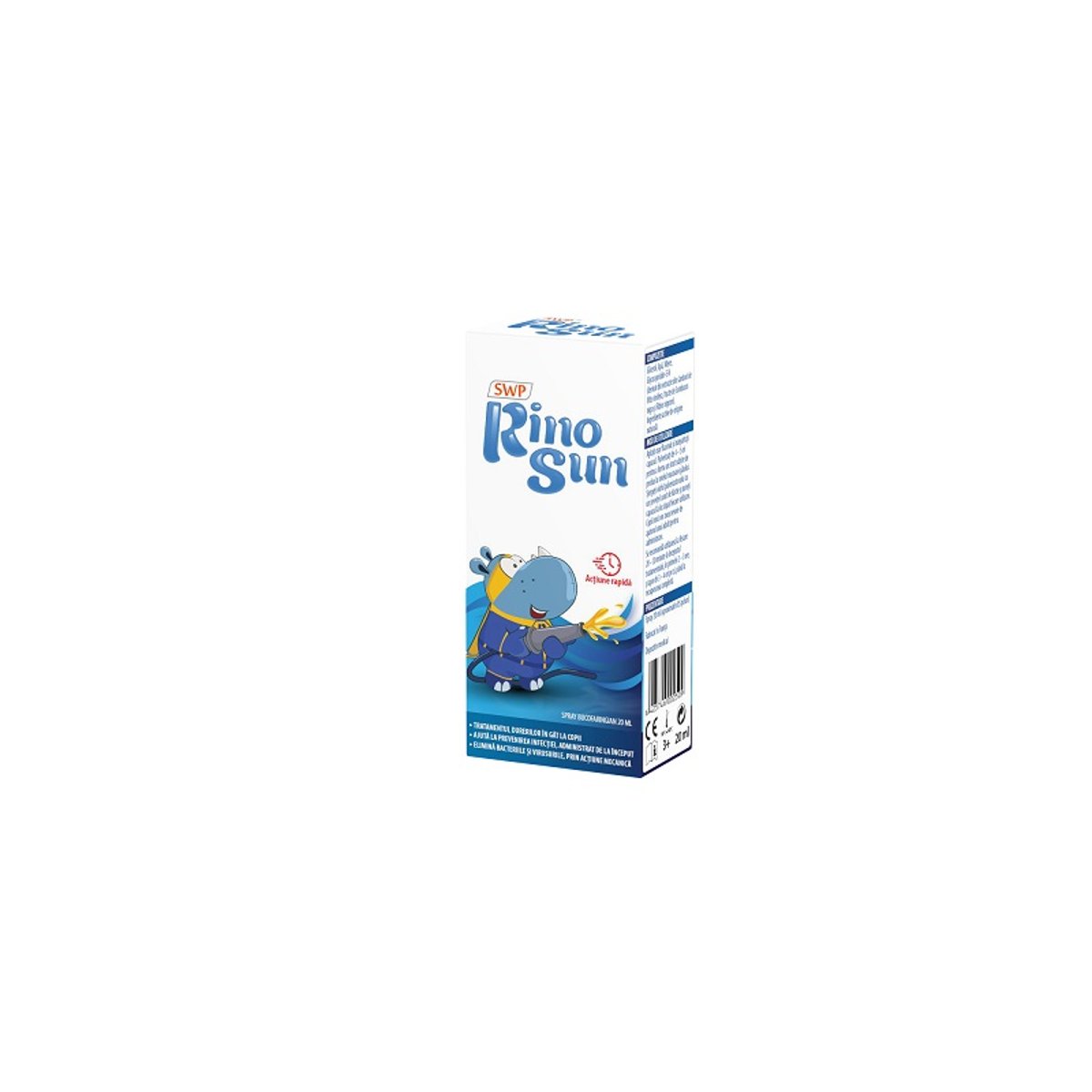 Indicatie: Bandaj lichid ¬lmogen pentru tratamentul durerilor in gat la copiii cu varsta cuprinsa intre 3 si 16 ani. Prezentare: Recipient de aluminiu de 20 ml (aprox. 85 de pulverizari). Mod de actiune: SWP RinoSun este o solutie ¬lmogena, vascoasa, hipertonica destinata tratamentului durerii in gat la copiii cu varsta de 3 ani sau mai mult. Cand este pulverizat pe suprafata gatului, SWP RinoSun formeaza o pelicula activa osmotic, dar rezistenta, care atrage mecanic lichidul hipotonic din partile profunde ale gatului. Acest flux exterior puternic si continuu de lichid detaseaza si dreneazamecanic contaminantii prezenti pe suprafata gatului, inclusiv bacteriile, particulele de virus libere, celulele moarte si moleculele de proteine care plutesc liber. Acest produs actioneaza astfel ca o solutie de curatare instantanee. Curatarea suprafetei gatului favorizeaza repararea si apararea mucoasei. SWP RinoSun actioneaza local, mecanic, fara a ¬ absorbit in organism. De asemenea, pelicula protejeaza suprafata gatului de iritatii si agresiuni externe. Rezultatele clinice arata o reducere rapida si vizibila a durerii in gat, iritatiei, inrosirii si inflamatiei, precum si a depozitelor albicioase de pe suprafata gatului. Aceasta reducere a contaminantilor bacterieni minimizeaza nevoia de antibiotice. Mod de utilizare: Agitati usor recipientul de pulverizare, indepartati capacul si, inainte de prima utilizare, amorsati pompa apasand pe pulverizator o data sau de doua ori. Indreptati varful deschiderii recipientului asa cum se arata in ilustratia de mai jos si apasati pulverizatorul aplicand presiune cu degetul pentru a elibera produsul in partea superioara a gatului. Aplicati 4 pulverizari pentru a forma un strat subtire de produs pe suprafata gatului. Produsul ¬ind vascos, pe varful pulverizatorului pot ramane unele picaturi; stergeti varful cu hartie absorbanta curata si puneti la loc capacul sticlei dupa ¬ecare utilizare. Pentru copii, produsul trebuie aplicat de catre un adult sau cel putin cu supravegherea si/sau asistenta unui adult. Va recomandam sa utilizati sprayul la ¬fiecare 30 de minute in primele 2 ore de la inceputul tratamentului si de 3 ori pe zi dupa aceea. Ingrediente: Compozitie: Glicerol (74,63%), Aqua, Miere, Glicocianidin-E-N (derivat din extracte din seminte de Vitis vinifera, fructe de Sambucus nigra si Ribes nigrum). Atentionari si precautii: - Suplimentele alimentare nu inlocuiesc un regim alimentar variat si echilibrat si un mod de viata sanatos - A nu se depasi doza recomandata pentru consumul zilnic - A nu se lasa la indemana si la vederea copiilor mici - A se consuma de preferinta inainte de sfarsitul datei de expirare inscrisa pe ambalaj - Produsul contine ingrediente derivate din soia, fiind contraindicat persoanelor alergice la soia -A se pastra la temperaturi intre 15 si 25¿¿¿C -A se feri de lumina si umezeala