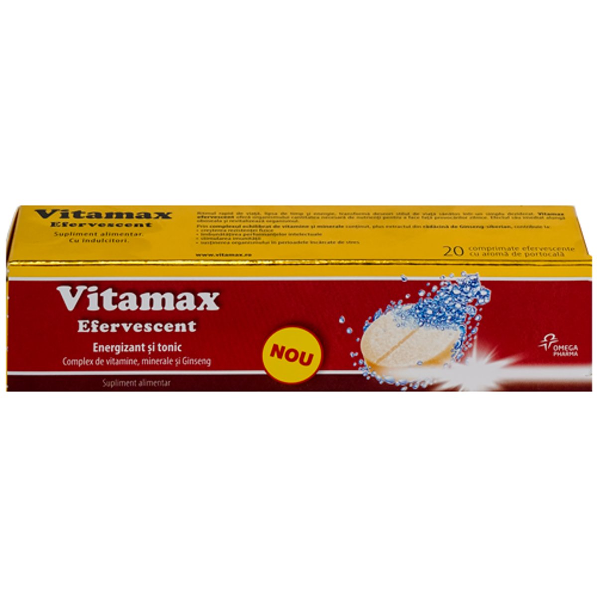 Complex echilibrat de vitamine si minerale, plus extract din radacina de Ginseng-siberian. Vitamax Efervescent contribuie la: Cresterea rezistentei fizice; Imbunatatirea performantelor intelectuale; Stimularea imunitatii; Sustinerea organismului in perioadele incarcate de stres. Reducerea oboselii si extenuarii Cresterea sperantei de viata si imbunatatirea calitatii vietii Mentinerea normala a nivelului de vitamine si minerale Mod de administrare: un comprimat efervescent pe zi, dupa micul dejun. Compozitie Acid citric anhidru E330- acidifiant; carbonat acid de sodiu E500 (ii) - corector de aciditate; sorbitol E420 - indulcitor; mix de vitamine (acid ascorbic, acetat de DL alfa-tocoferil, nicotinamida, D-pantotenat de calciu, clorhidrat de piridoxina, riboflavina, mononitrat de tiamina, acid folic, biotina, cianocobalomina, cu un continut de 28% maltodextrina); aroma de portocale (maltodextrina, guma arabica, acid ascorbic), extract hidroalcoolic din radacina de Ginseng-siberian (Eleutherococcus senticosus) cu 0,8% eleutherozide; ciclamat de sodiu E 592 - indulcitor; citrat de fier; suc de sfecla rosie in pulbere (maltodextrina, acid citric) - colorant; citrat de zinc trihidrat; zaharina sodica 15% E954 - indulcitor; acetat de vitamina A, riboflavina E 101 - colorant; colecalciferol, sulfat de cupru anhidru.
