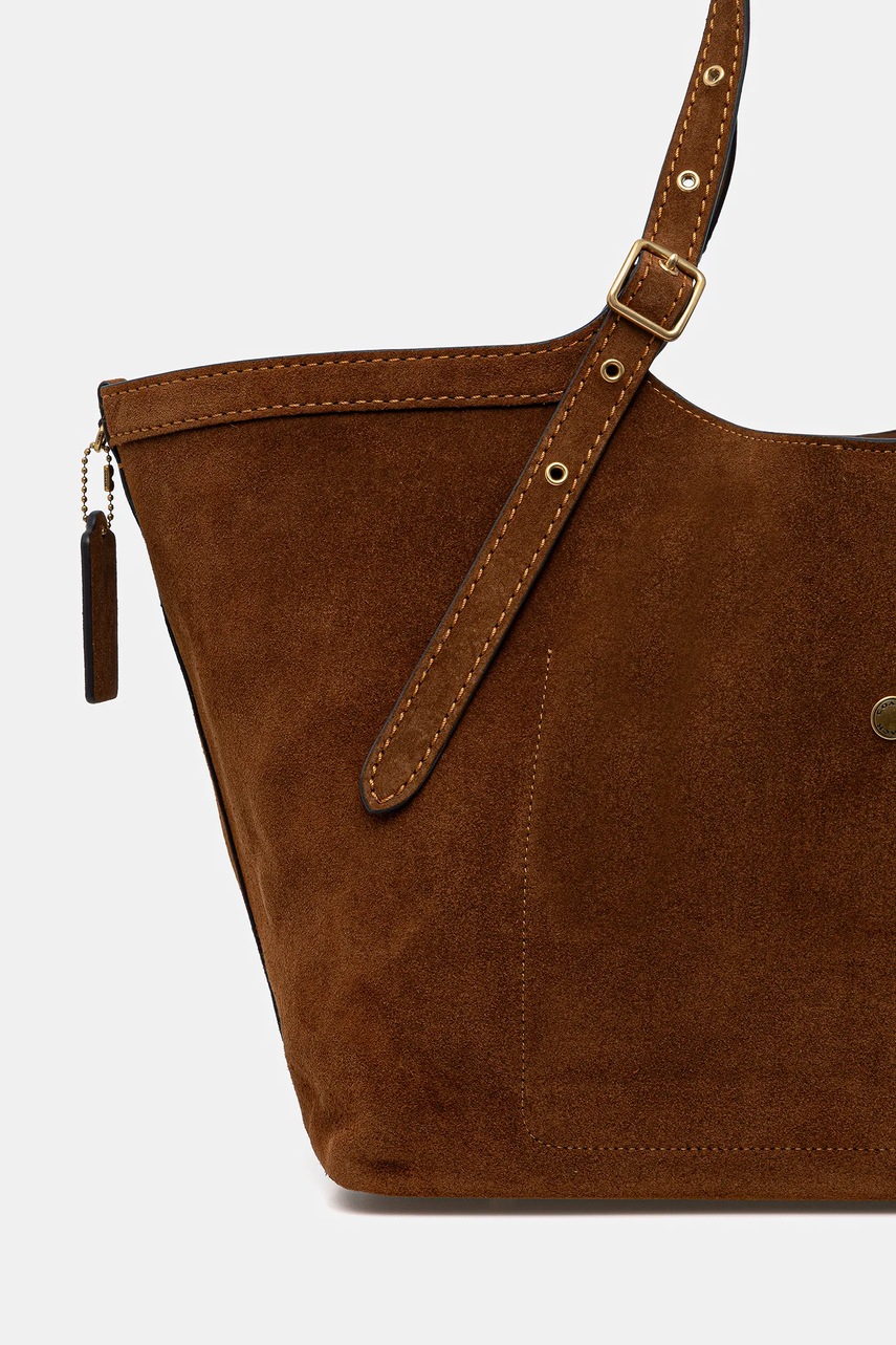 Poșetă mare din colecția Coach. Cu fixare model confecționat din piele întoarsă.