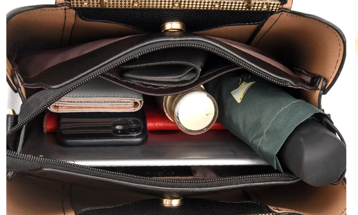 Geanta neagra de dama Caracteristici: - Dimensiuni (L x l x h): 30 x 13 x 23 cm - Material: piele ecologica - Culoare: neagra - Se inchide la partea superioara cu fermoa si capse - Este incapatoare, iar la interior este divizata in mai multe compartimente (vedeti poza) - Este prevazuta cu torti si o curea pentru a fi purtata pe umar - Stil: elegant, office