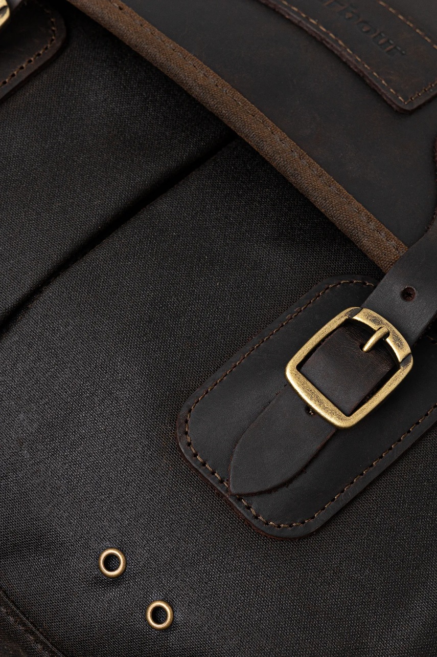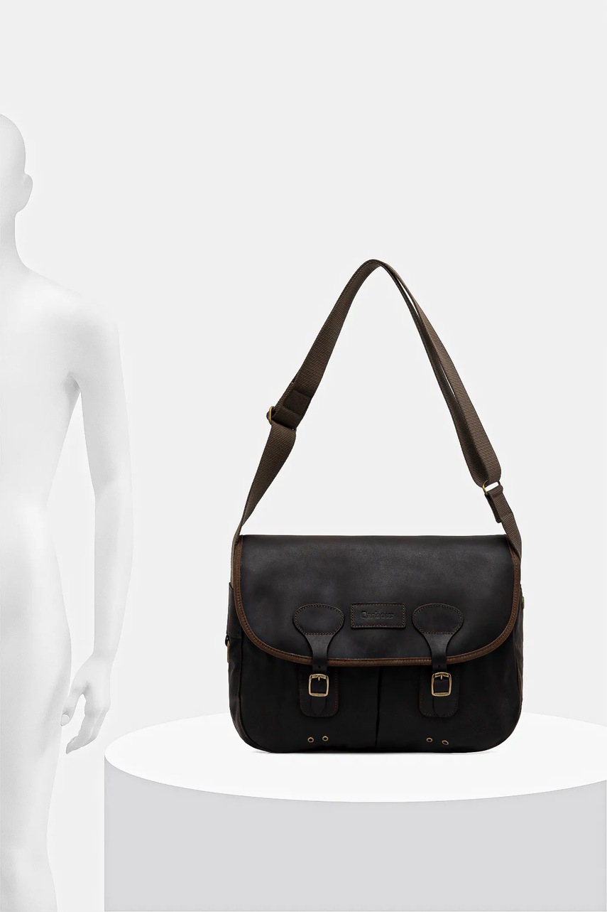Barbour geantă maro din bumbac cerat (waxed cotton), căptușită, curea lungă reglabilă, nedetașabilă, format A4, 1 compartiment, buzunar frontal