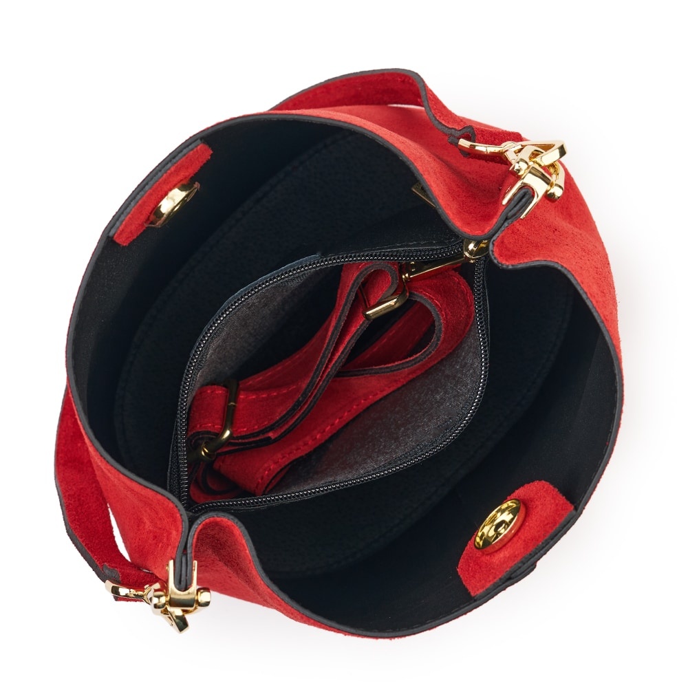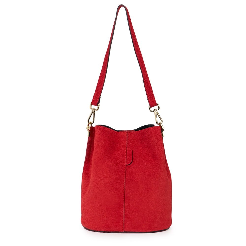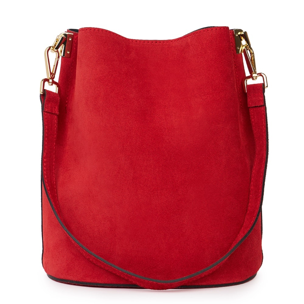 Geanta din piele naturala Milena rosie este un accesoriu elegant si versatil, ideal pentru un stil modern, discret. Realizata din piele intoarsa, cu un aspect deosebit de elegant, geanta impresioneaza prin textura fina si finisajele impecabile. Forma sa tip „bucket bag” ofera un spatiu generos pentru obiectele esentiale de zi cu zi, in timp ce sistemul de inchidere sigur si cureaua de umar reglabila asigura confort si functionalitate. MATERIAL: piele naturala DIMENSIUNI (inaltime x lungime x latime): 28x24x17cm COMPARTIMENTE: doua compartimente separate de un buzunar cu fermoar BUZUNARE: fara buzunare SISTEM DE PRINDERE: bretea de umar detasabila scurta (53 cm) + bretea de umar detasabila, reglabila (50-123cm) CULOARE ACCESORII: auriu